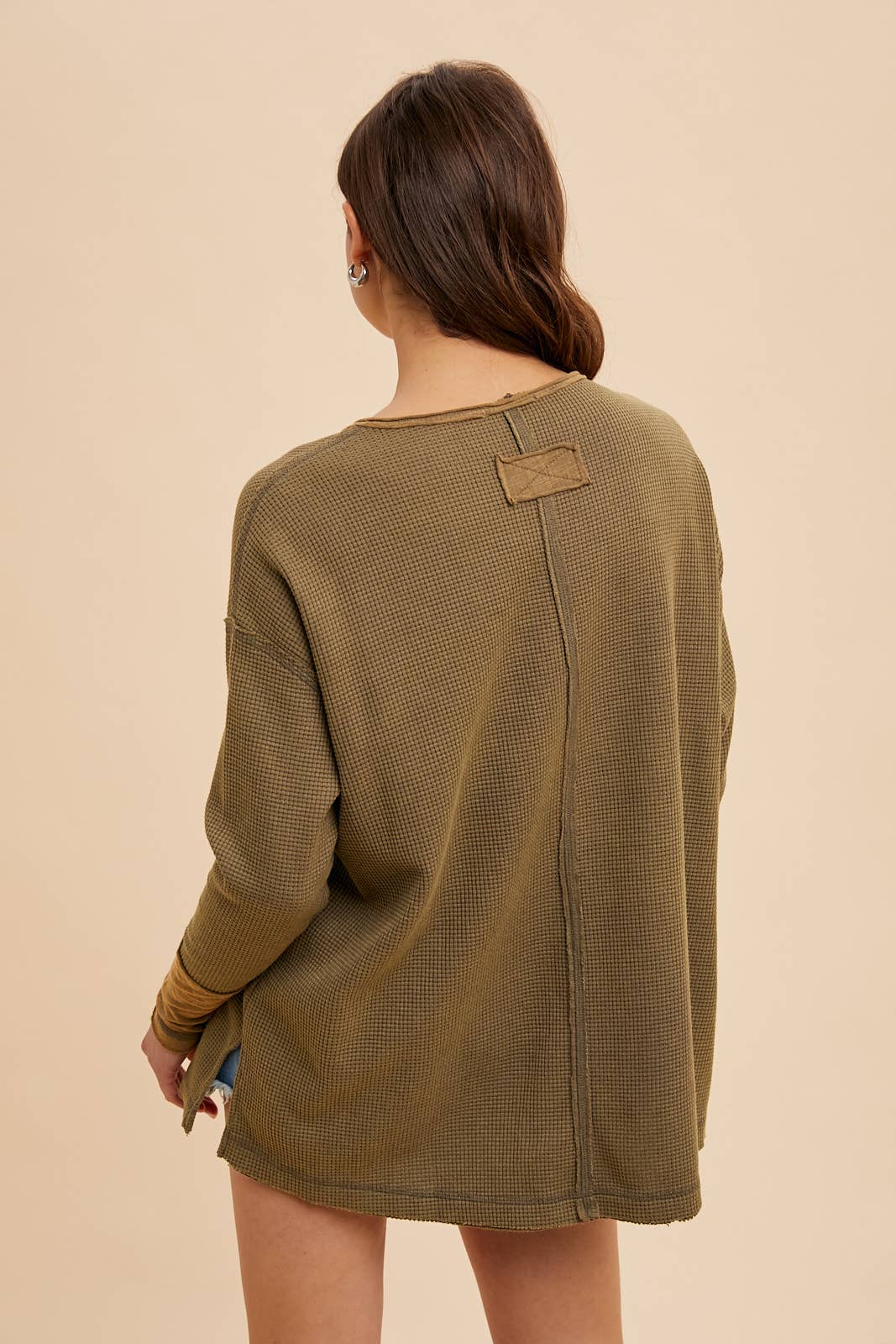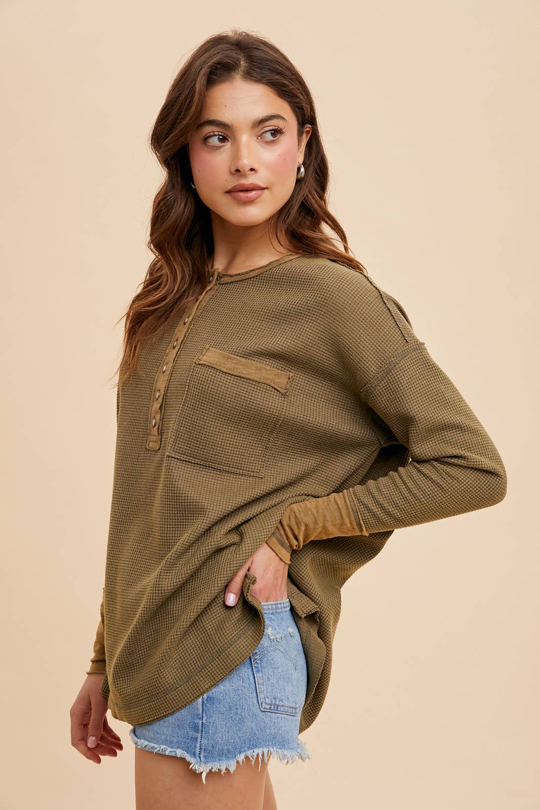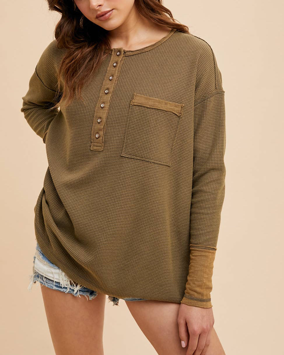 A lived-in essential with just the right edge. The Hedy Henley in olive features soft garment-washed fabric, cozy drop shoulders, and subtle contrast trim for a perfectly undone vibe. Its oversized fit and snap-button neckline make it an effortless pick for layering all season long.