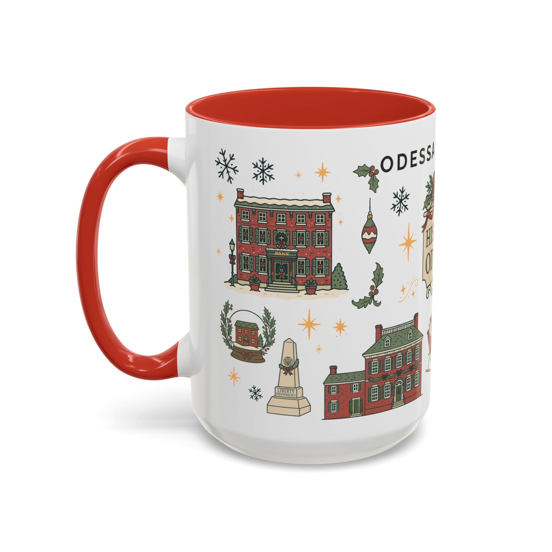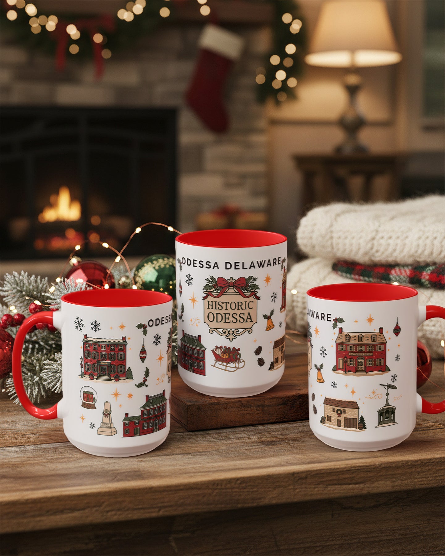 Celebrate the magic of Historic Odessa with this festive ceramic mug, wrapped in original holiday illustrations inspired by the beloved stops along the Historic Odessa Foundation. From the iconic brick façades of Cantwell’s Tavern and the Old Bank to the timeless charm of Wilson-Warner, Wilson Barn, and Corbit-Sharp Houses, each building is lovingly sketched in a cozy, vintage-Christmas style. American holly (the Delaware state tree) winds through the design with berries, bows, and seasonal accents, creating a nostalgic winter scene that feels straight out of a storybook.