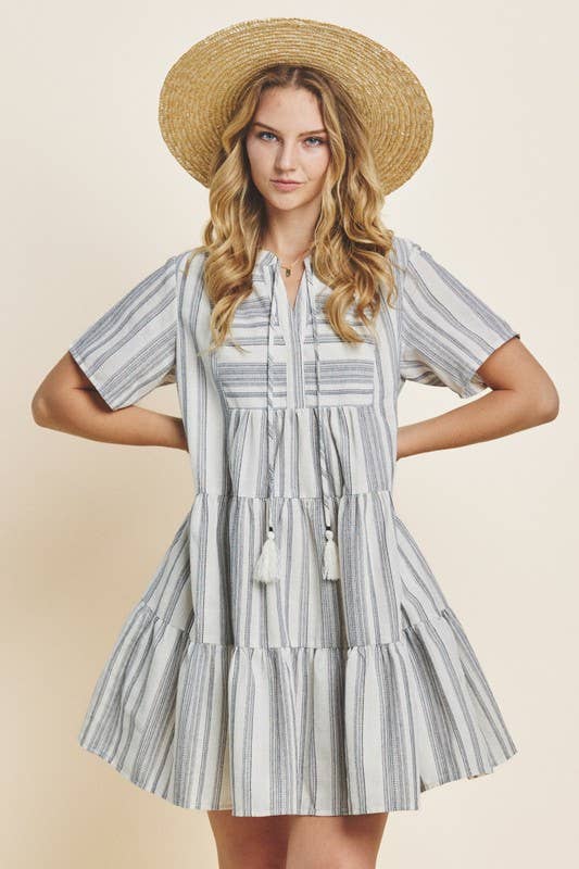 Classic meets playful in the Gabriella Mini Dress. Featuring a navy and white yarn-dye stripe print, this tiered silhouette includes a split neckline with a tie closure and short sleeves for a breezy, flattering fit. Lightweight and lined for comfort, it's a go-to for casual days, brunches, and summer events.