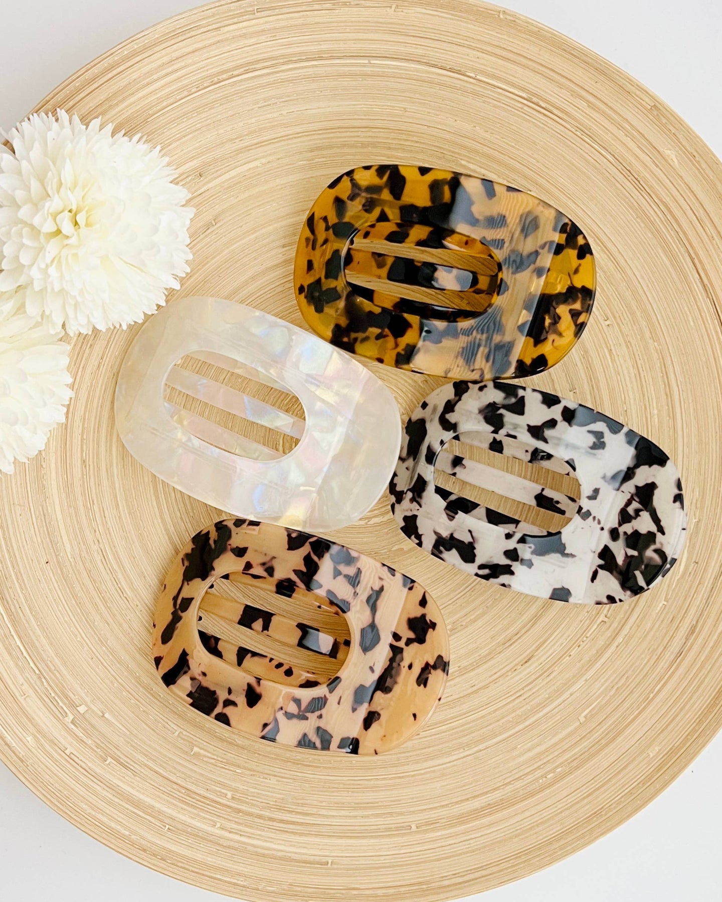 Light and lovely, the Large Flat Claw Clip in blonde tortoise is your new favorite neutral. The soft honey and black tones with a smooth flat-back shape make this 5" clip both beautiful and comfortable. A dreamy pick for sun-kissed styles, easy updos, or gifting the effortlessly chic friend in your life.