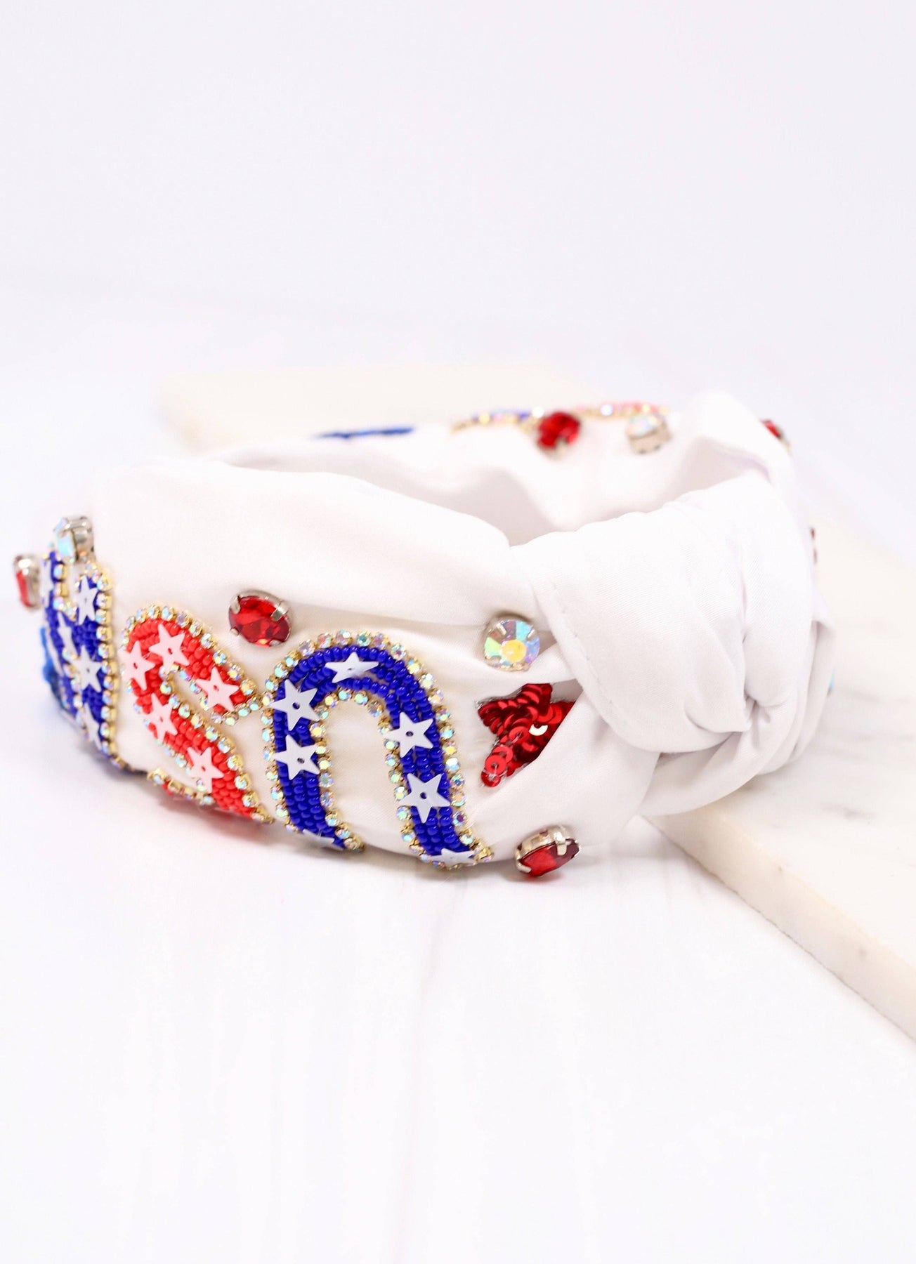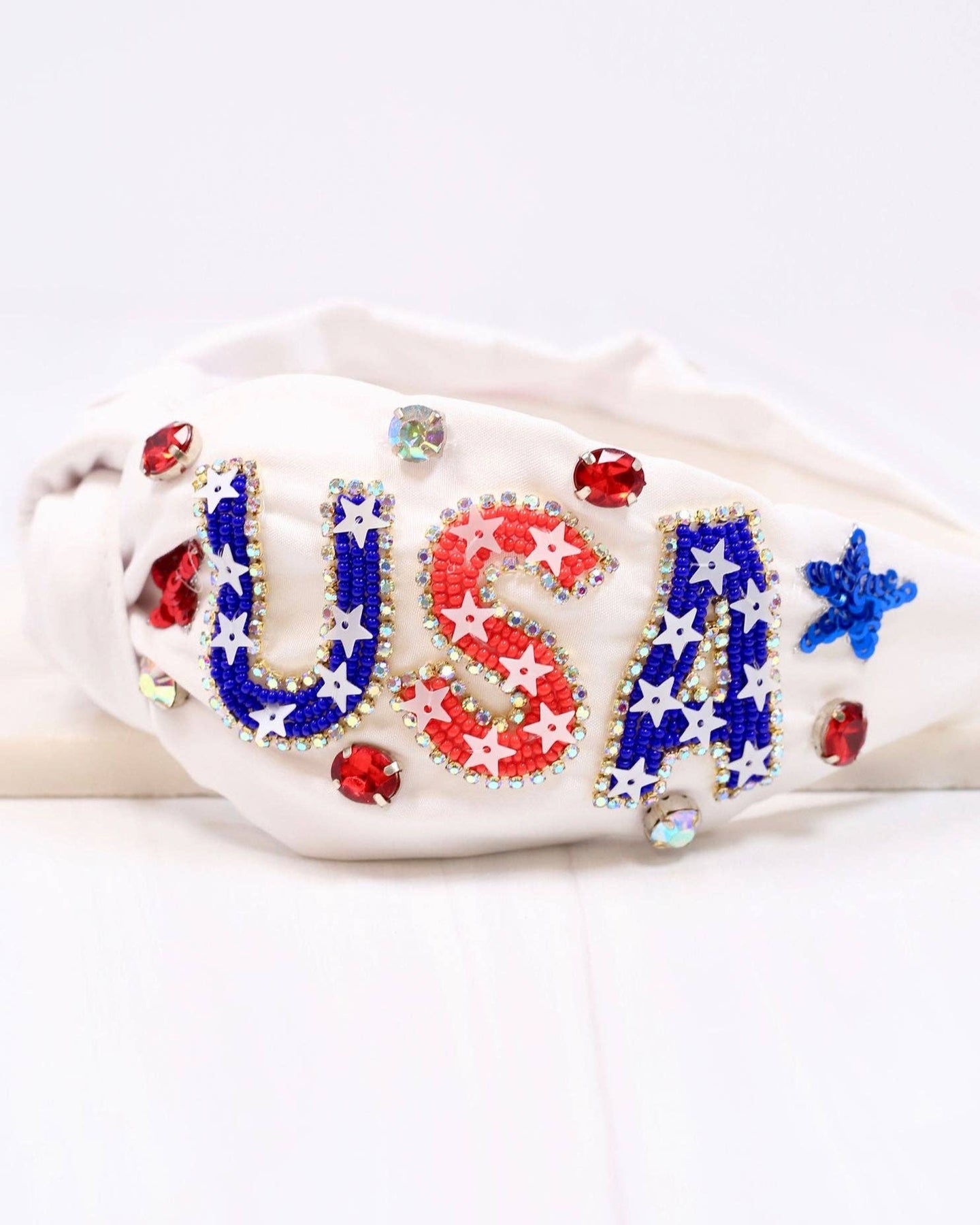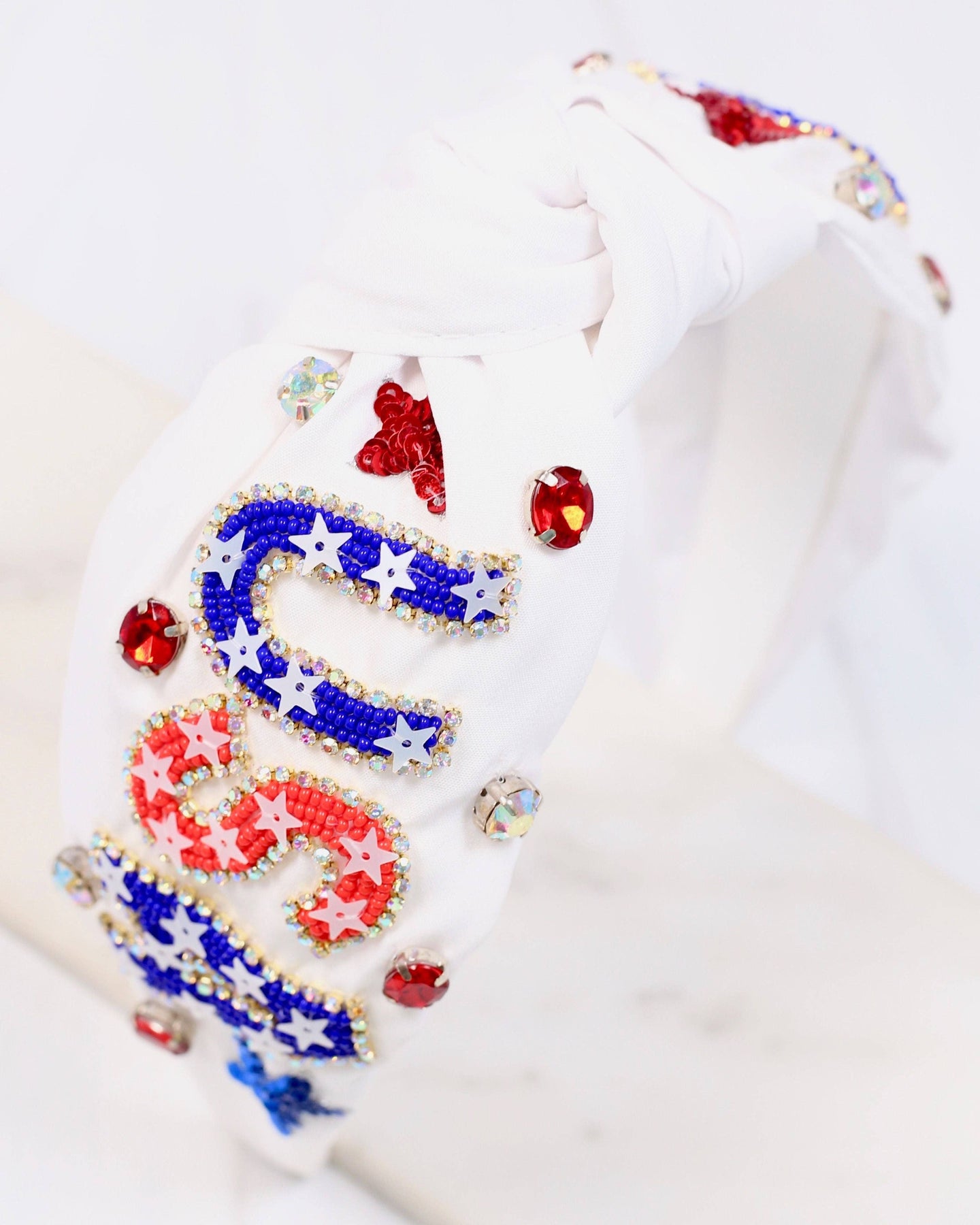 Get ready to celebrate the USA with this patriotic fabric headband! It is embellished with beading, sequins, and accent rhinestones.