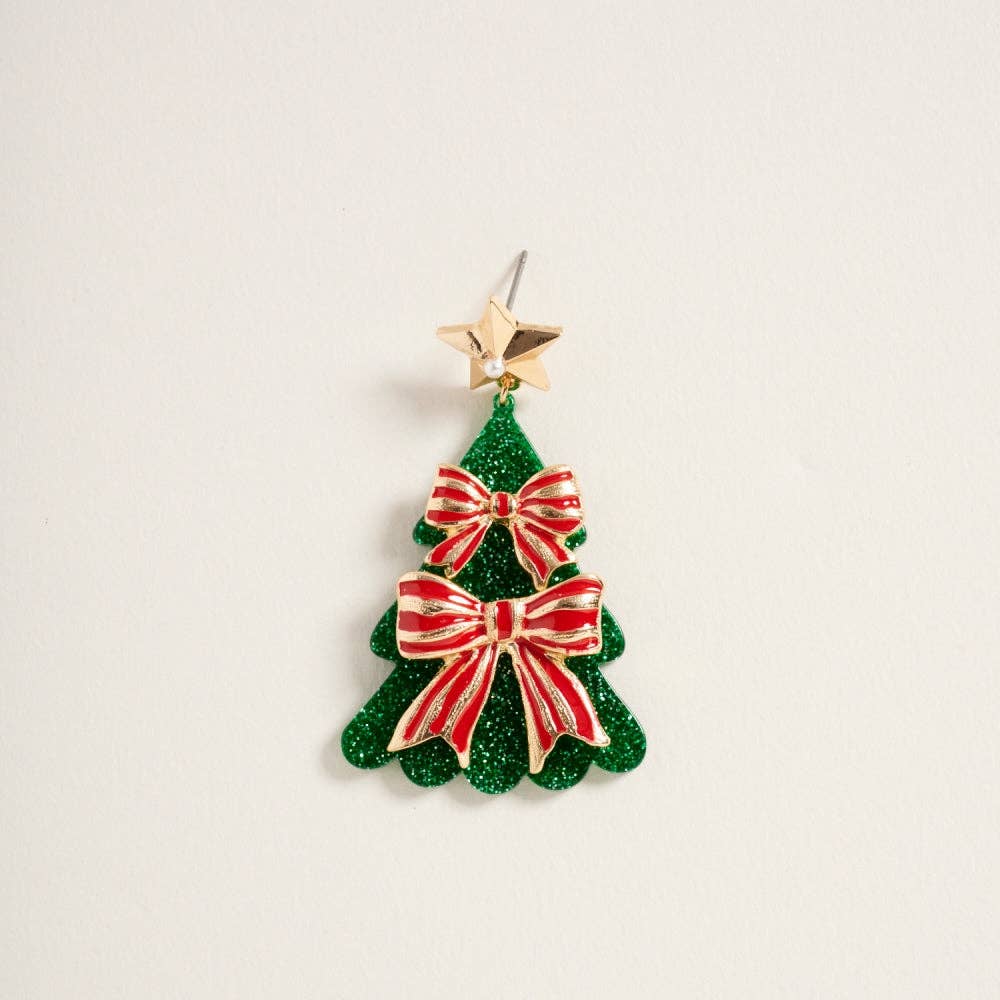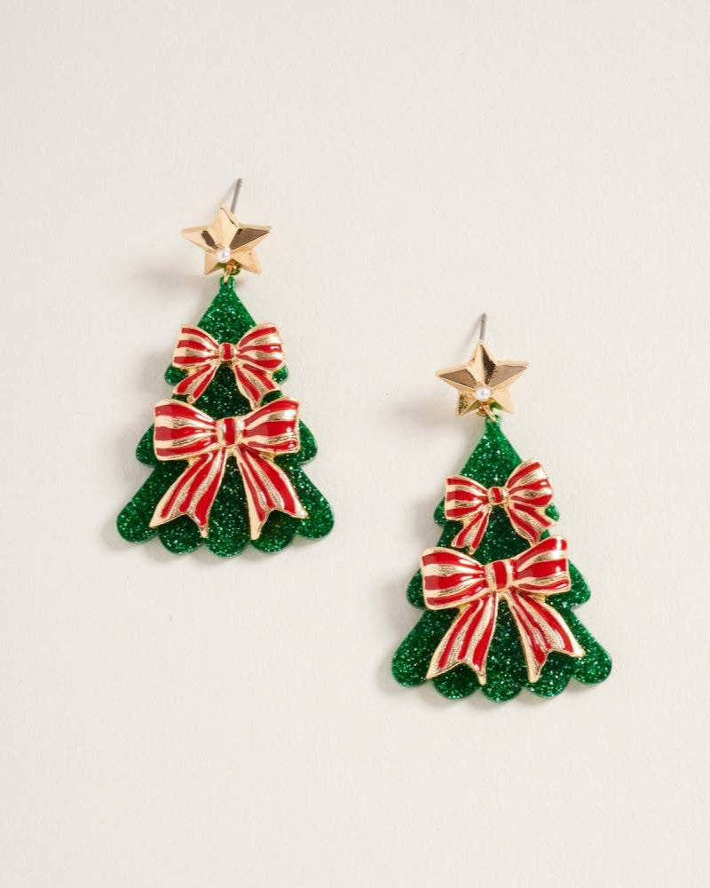 Bring on the sparkle! These glittering Christmas tree earrings are topped with bright red bows and full of festive flair from top to trunk.