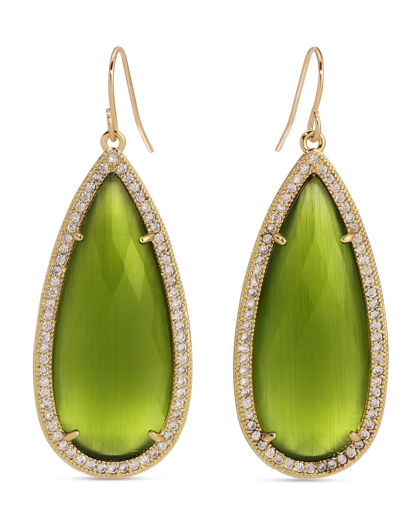 Elegant with a hint of drama, these long teardrop earrings feature olive cat’s eye stones framed in a sparkling pavé border. A standout piece for any season.