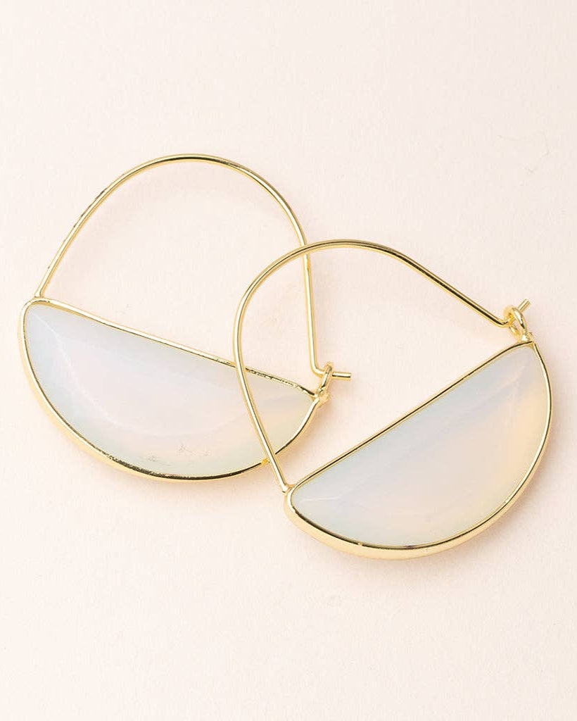 Embrace ethereal beauty with our Opalite half-circle stone earrings, designed to add a modern, minimal touch to your everyday look. With a 1 3/8" drop, these lightweight earrings offer just the right amount of shimmer and elegance. Crafted with semi-precious Opalite—known as the Stone of Healing—this stone is believed to support emotional balance, inner peace, and clarity. Finished with 14K gold-dipped wire, these versatile earrings can be styled polished or casual, making them a perfect companion for any occasion. Hypoallergenic and free from nickel and cadmium, they’re gentle on even the most sensitive ears. Each pair comes on an embossed leather card featuring the stone’s meaning, making them a meaningful gift or a soothing addition to your own collection.