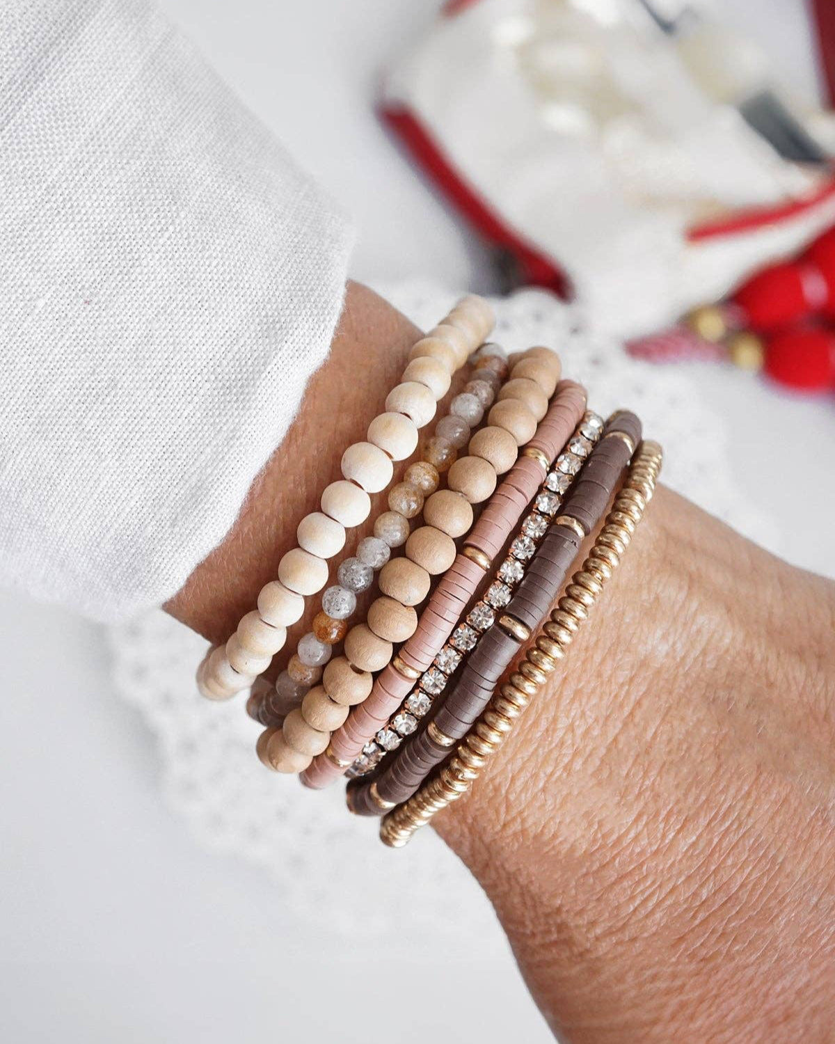 A boho dream in earthy neutrals, this 7-piece bracelet stack blends mixed media textures like wood, clay, crystal, and metal. With warm golden tones and organic shapes, it’s a ready-made wrist party you’ll reach for again and again.