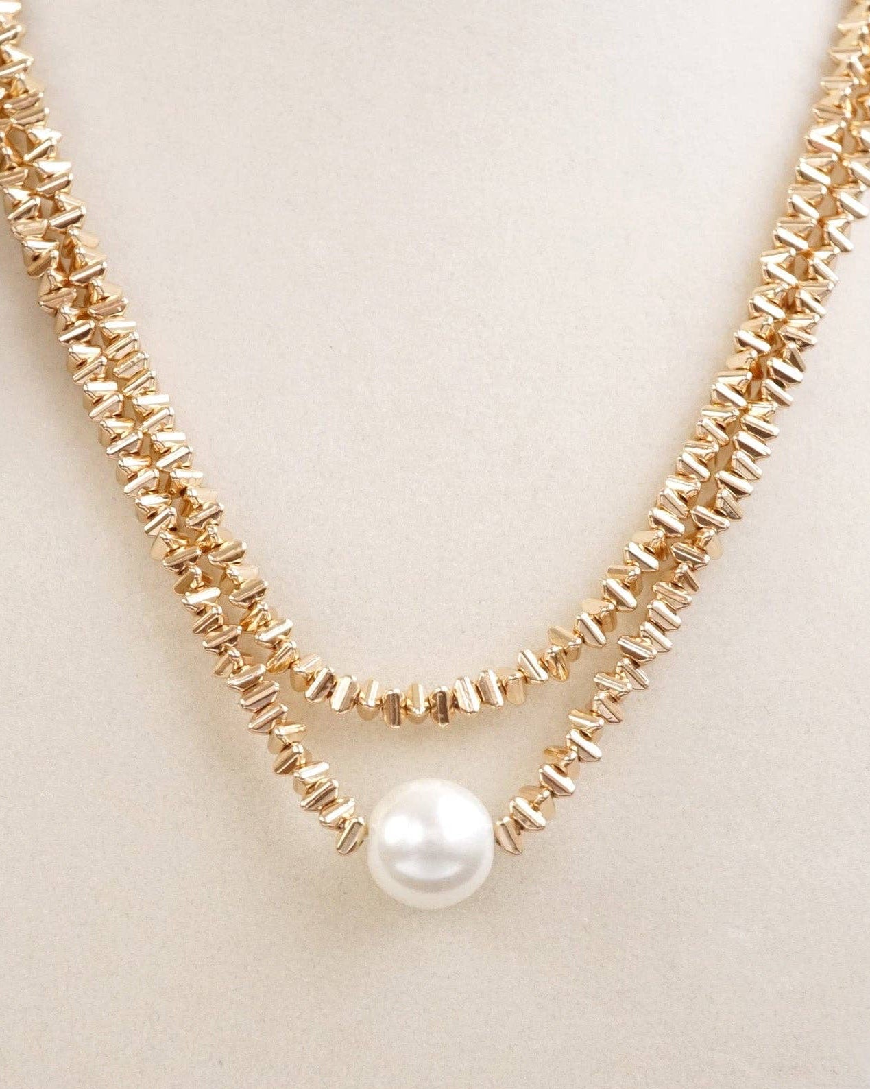 This layered necklace pairs sculptural triangle beads with a luminous pearl accent, creating an elegant look with just the right amount of texture and shine. Warm gold tones and a delicate silhouette make it perfect for layering or wearing solo.