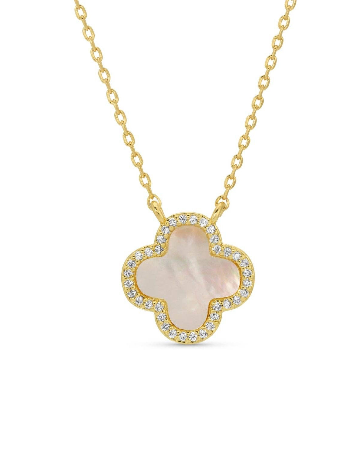 A symbol of luck and grace, this quatrefoil pendant necklace features a luminous shell center framed by a border of glittering cubic zirconia. The refined silhouette and iridescent glow add a touch of luxe to every day.