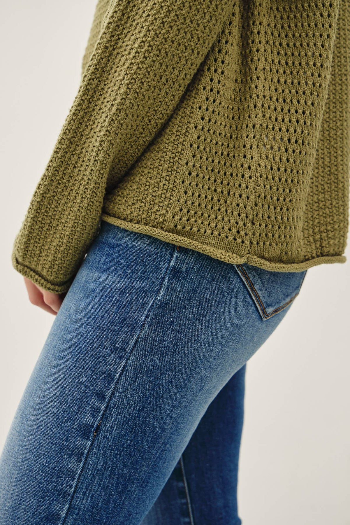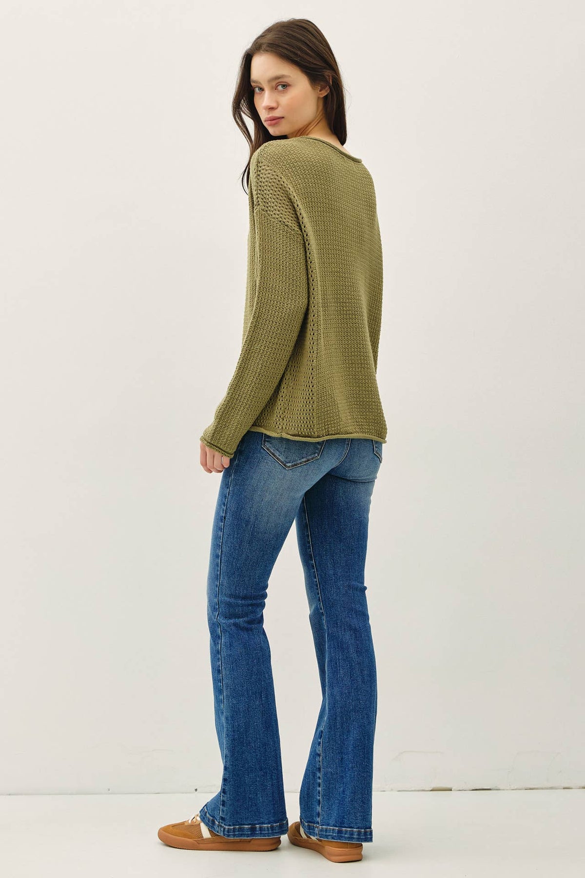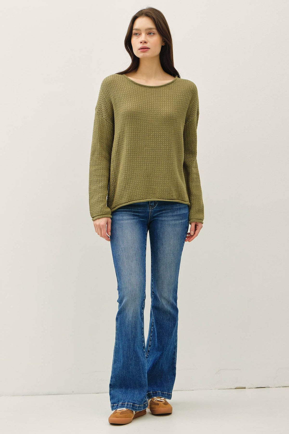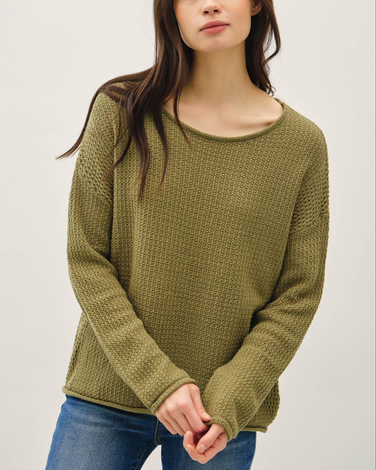 Meet your new favorite throw-on-and-go layer. With its cozy waffle knit and perfectly boxy shape, this olive green sweater delivers laid-back vibes and soft texture for chillier days.