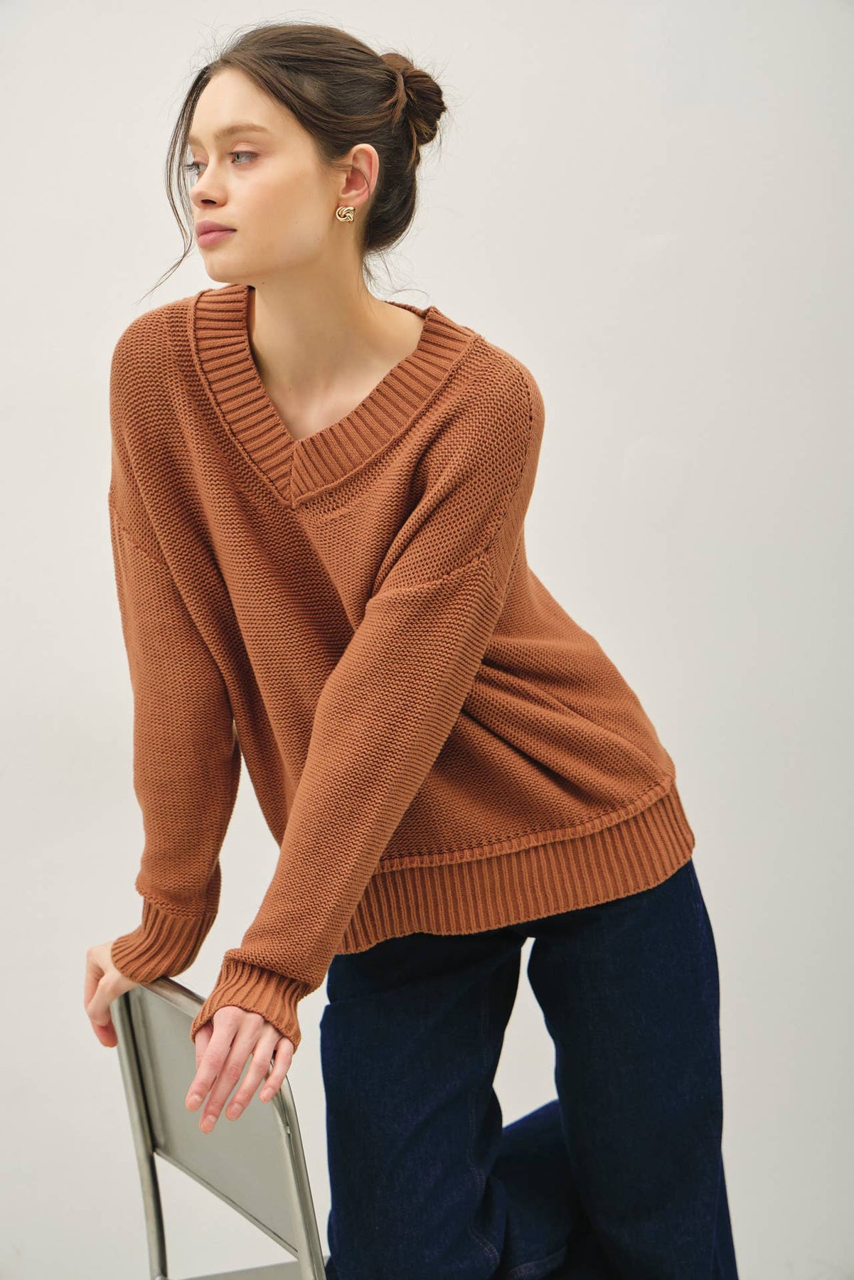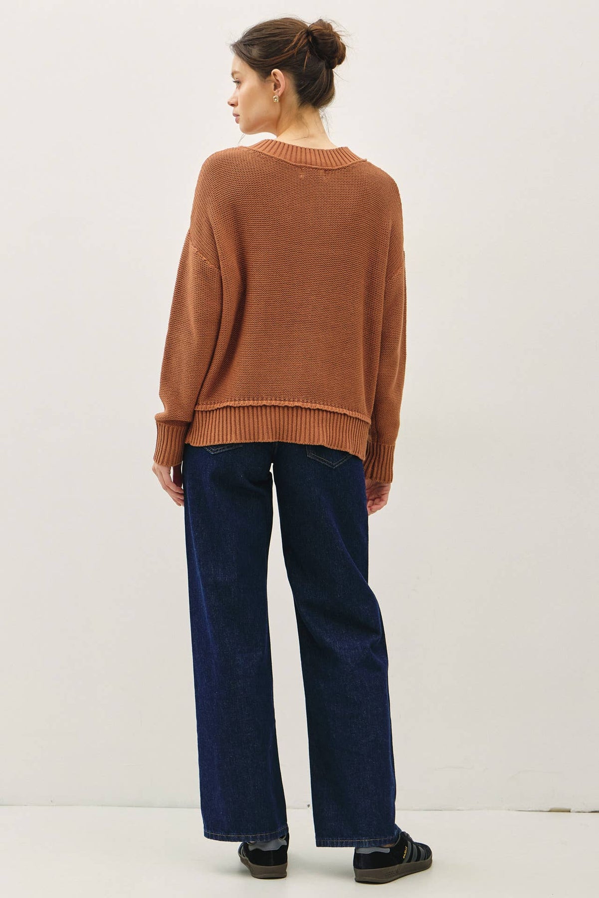 Bold and cozy, this chunky knit sweater in warm clay tones adds texture and warmth without compromising on comfort. The raw seam details and oversized fit make it a standout for fall layering.