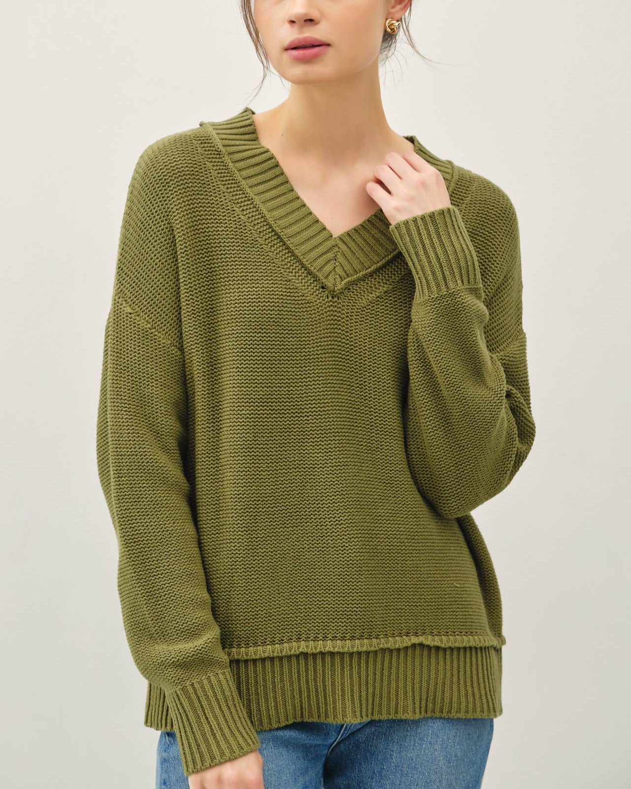 In an earthy olive hue, this chunky v-neck sweater brings a cool, undone vibe to your sweater rotation. The raw seams and oversized fit make it perfect for layering with ease.