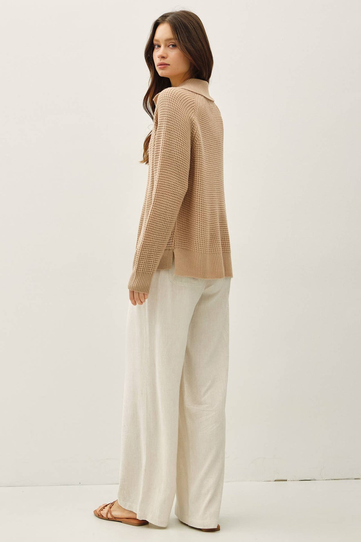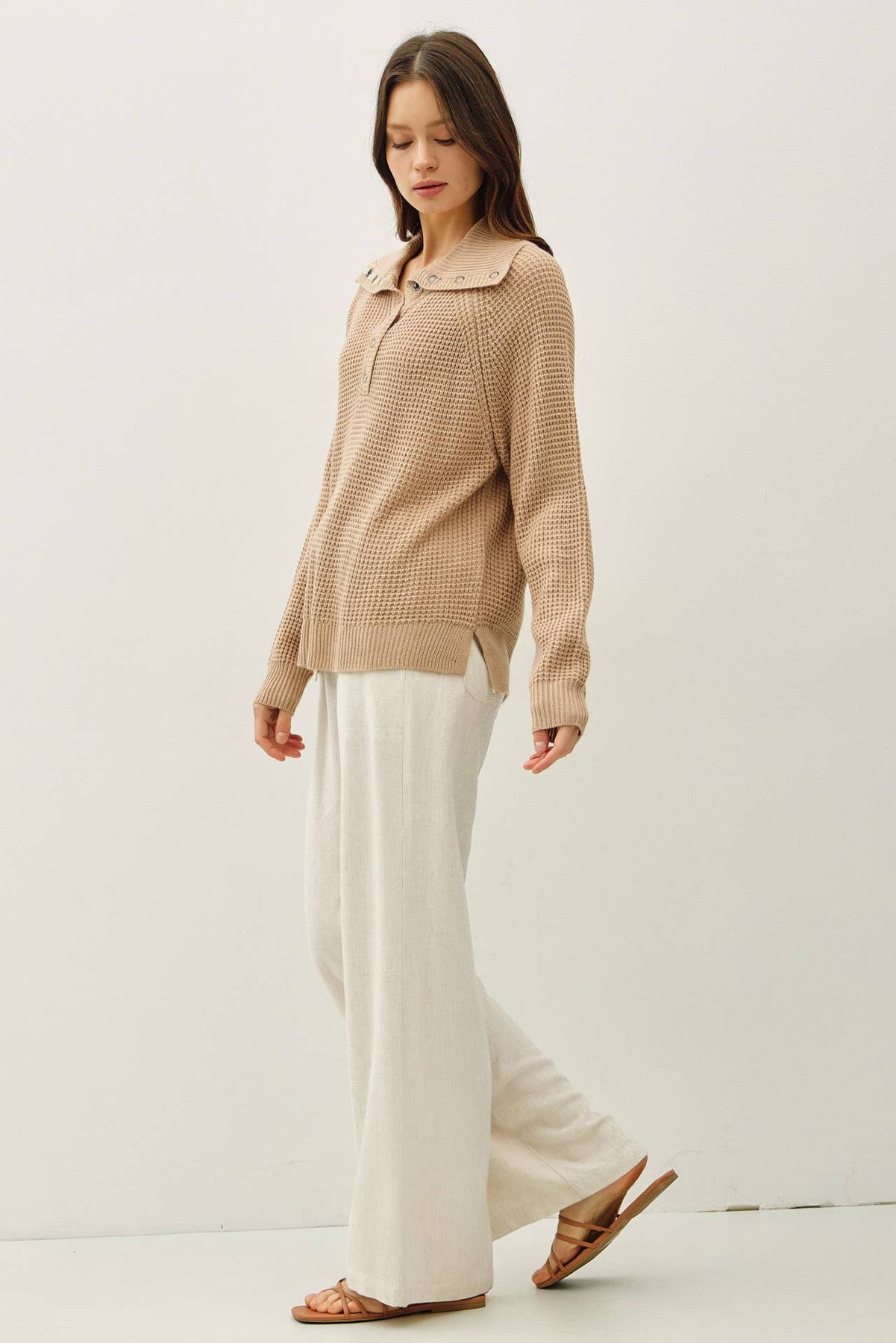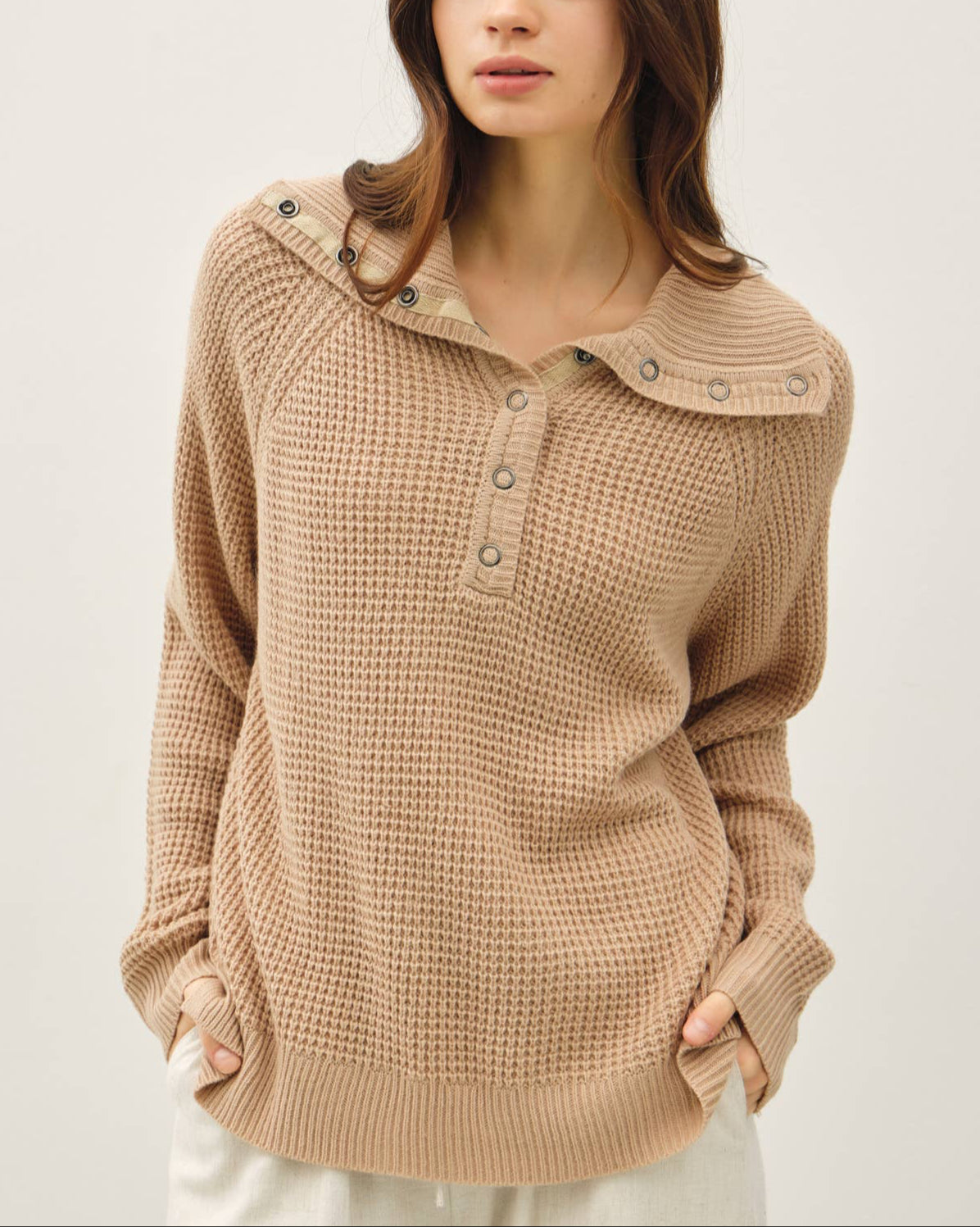Sweetly structured with a touch of prep, this waffle knit pullover brings charm to cooler days. The Peter Pan collar and snap-front detail make it stand out from the everyday, while the soft texture and relaxed fit keep things cozy. Ideal for coffee dates, lounging, or layering under a jacket when the weather shifts.