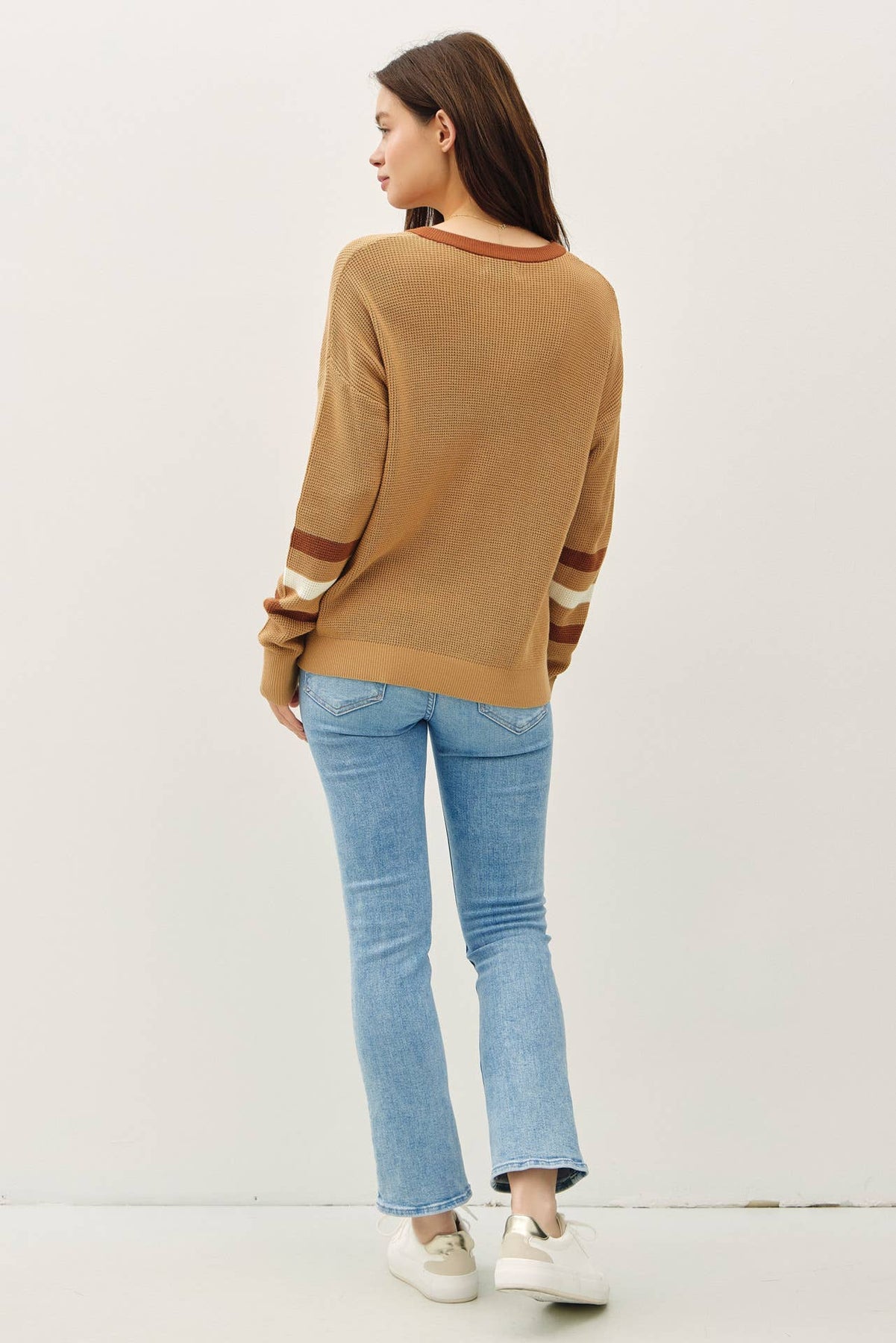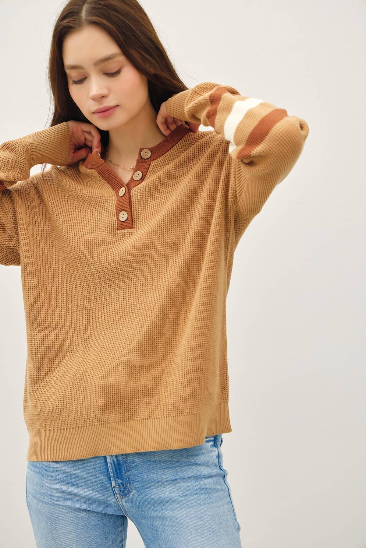 With its cozy waffle knit texture and sporty sleeve stripes, this multi-toned henley is your new go-to for laid-back days. The relaxed, boxy fit pairs effortlessly with jeans or leggings, while wooden buttons and a V-notch neckline give it that extra charm.