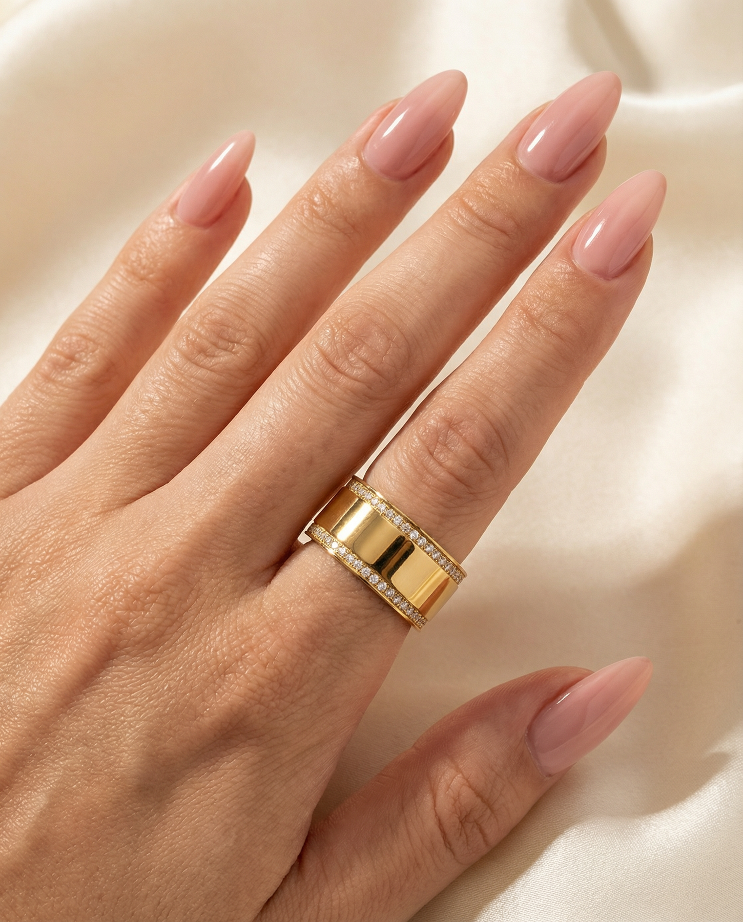 Bold yet refined, the Lily Ring is a modern statement with timeless appeal. Designed with a smooth gold-tone center band framed by delicate pavé-style accents, this ring strikes the perfect balance between clean lines and subtle sparkle.