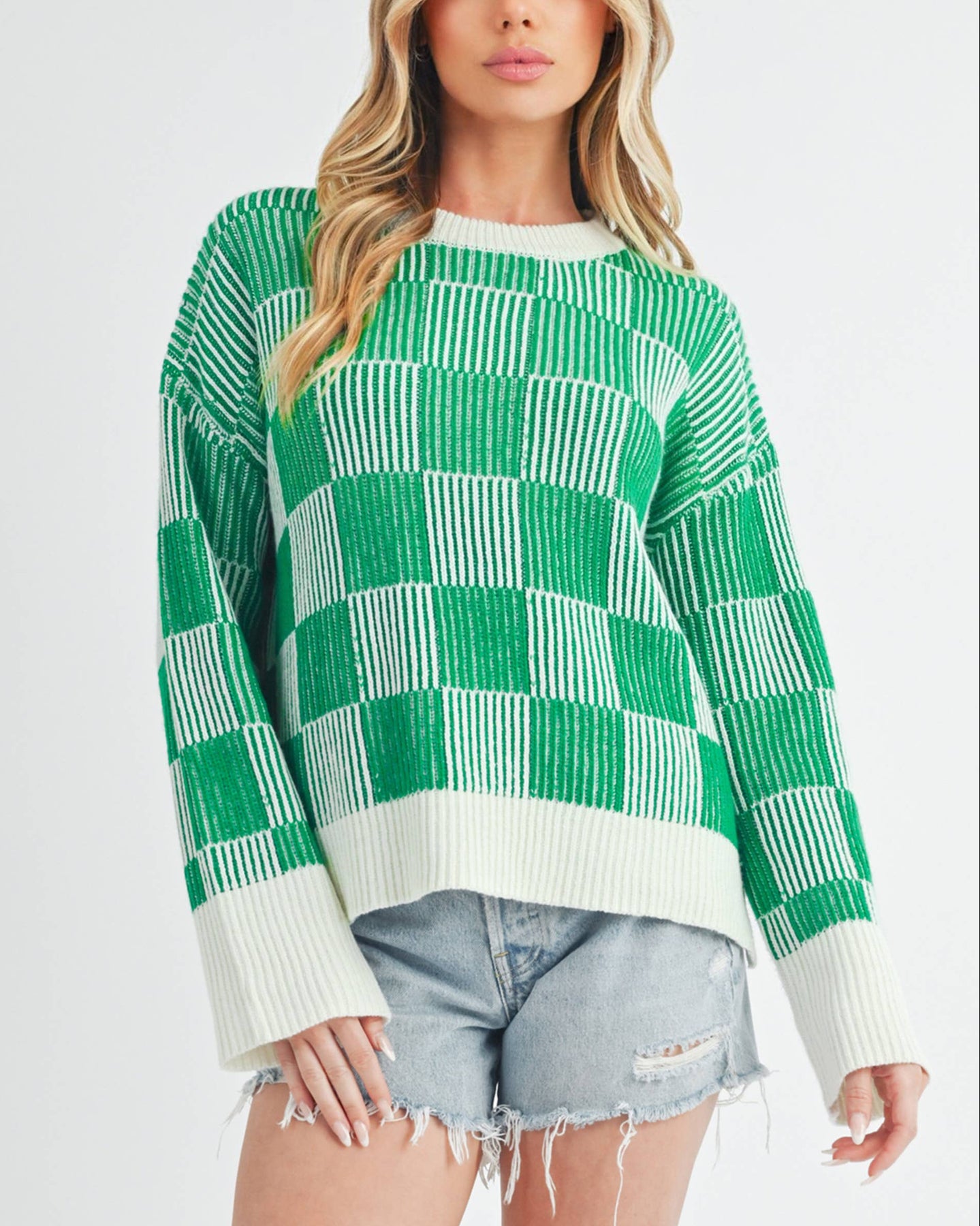 Sporty meets chic in the Zora Catalina Sweater, a bold yet wearable statement piece designed for effortless styling. This two-toned green checkerboard sweater features an oversized body and wide sleeves, giving it a relaxed, modern silhouette that feels both comfortable and intentional. Crafted in a soft yarn blend, it layers easily over tees or tanks and pairs just as well with denim as it does with tailored pants.