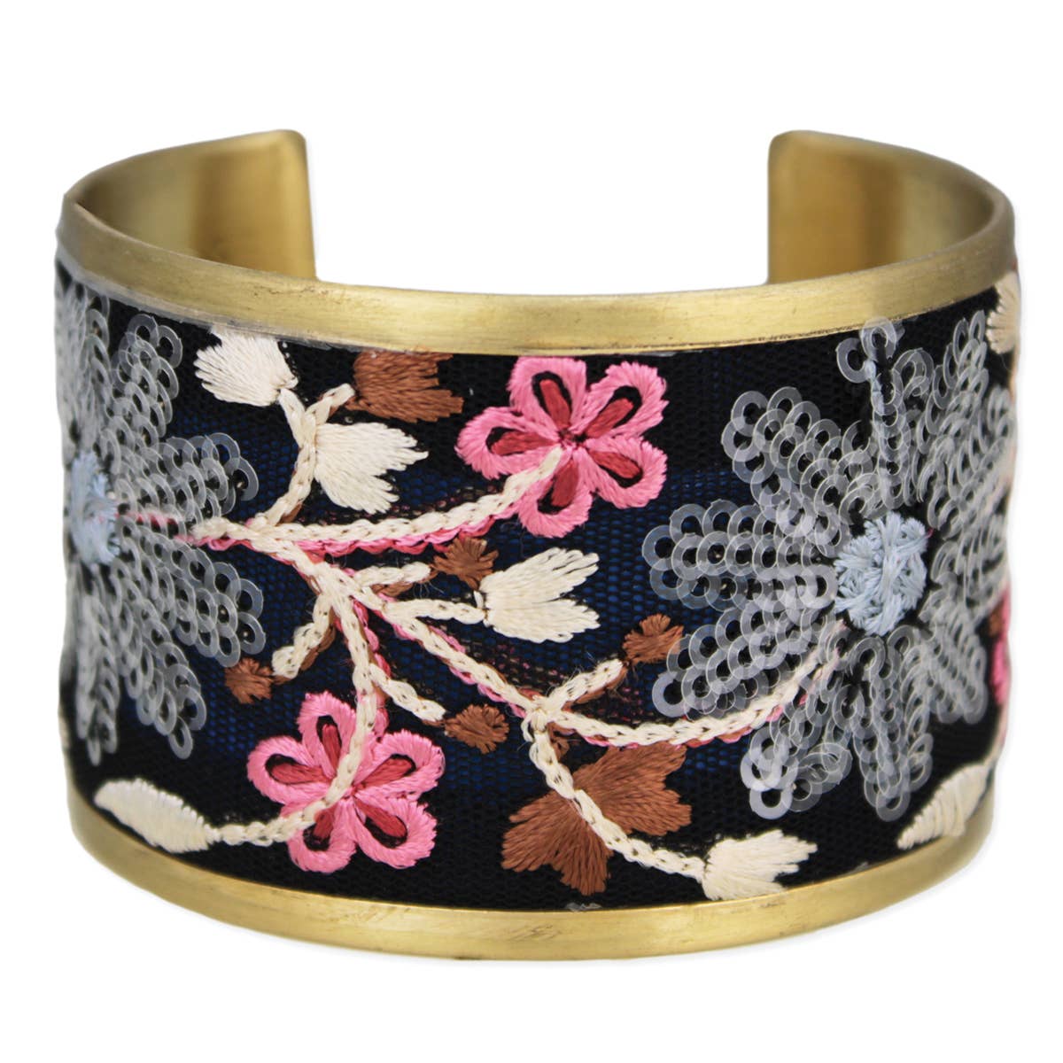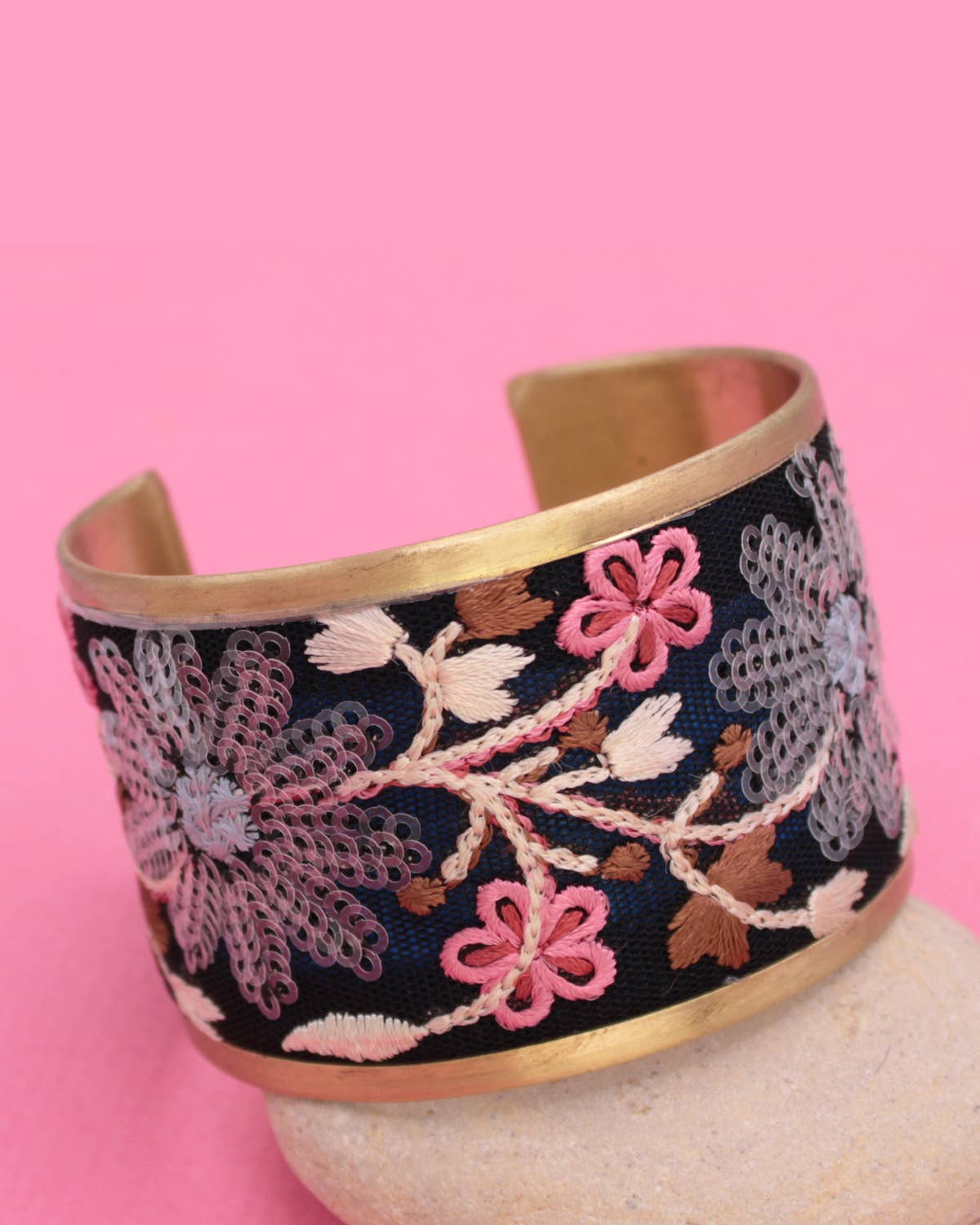 Striking and romantic, this vintage-inspired cuff bracelet features rich black fabric embroidered with vibrant pink and grey sequin florals. Set against a gold cuff base, the contrast feels bold yet refined, making it a beautiful accent for both everyday styling and special occasions.