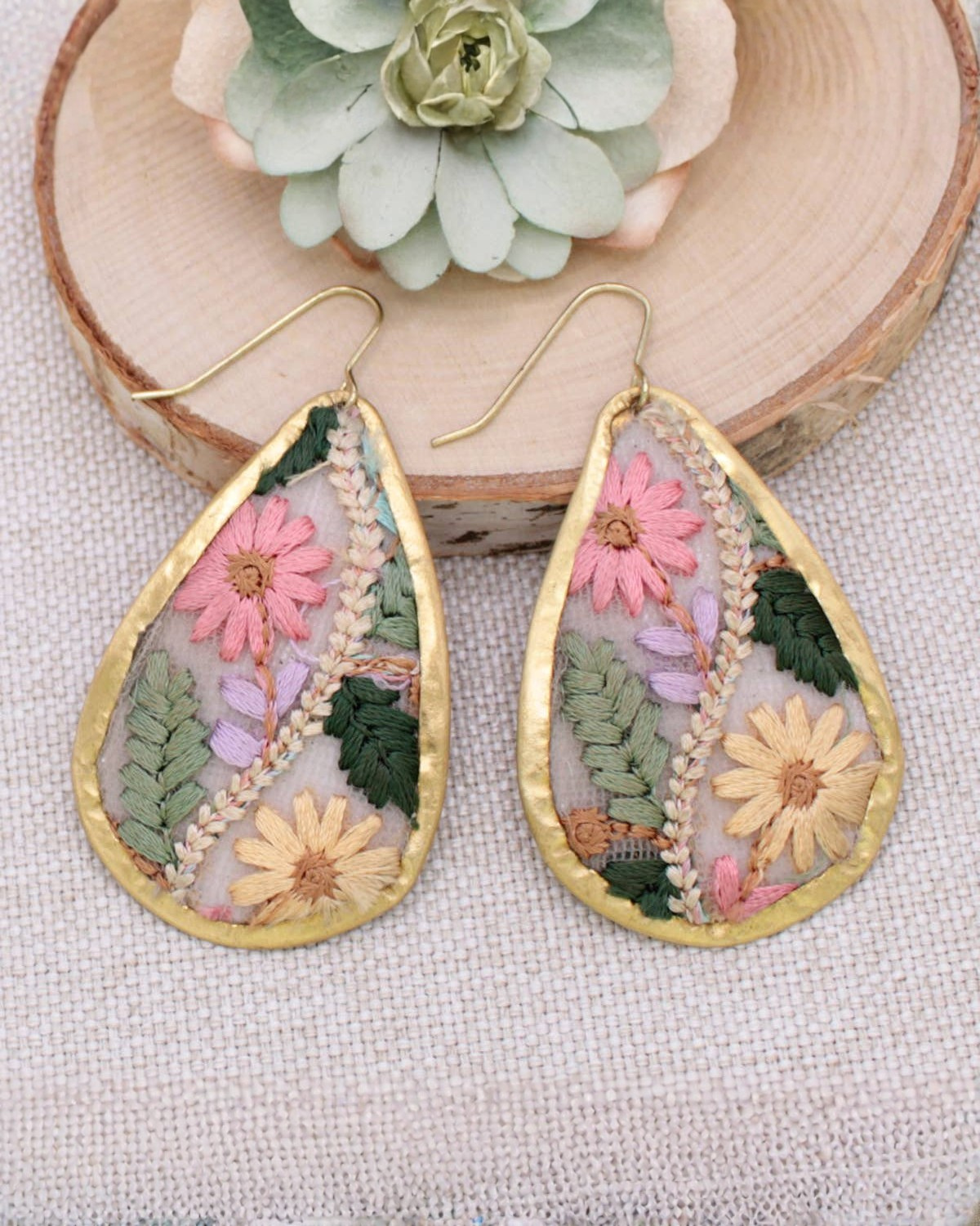 Soft, romantic, and beautifully handcrafted, these floral vine embroidered teardrop earrings bring nature’s elegance to your everyday look. Delicate pastel flowers and winding vines are stitched into fabric and framed by a gleaming gold teardrop border, creating a piece that feels feminine, vintage-inspired, and effortlessly graceful.