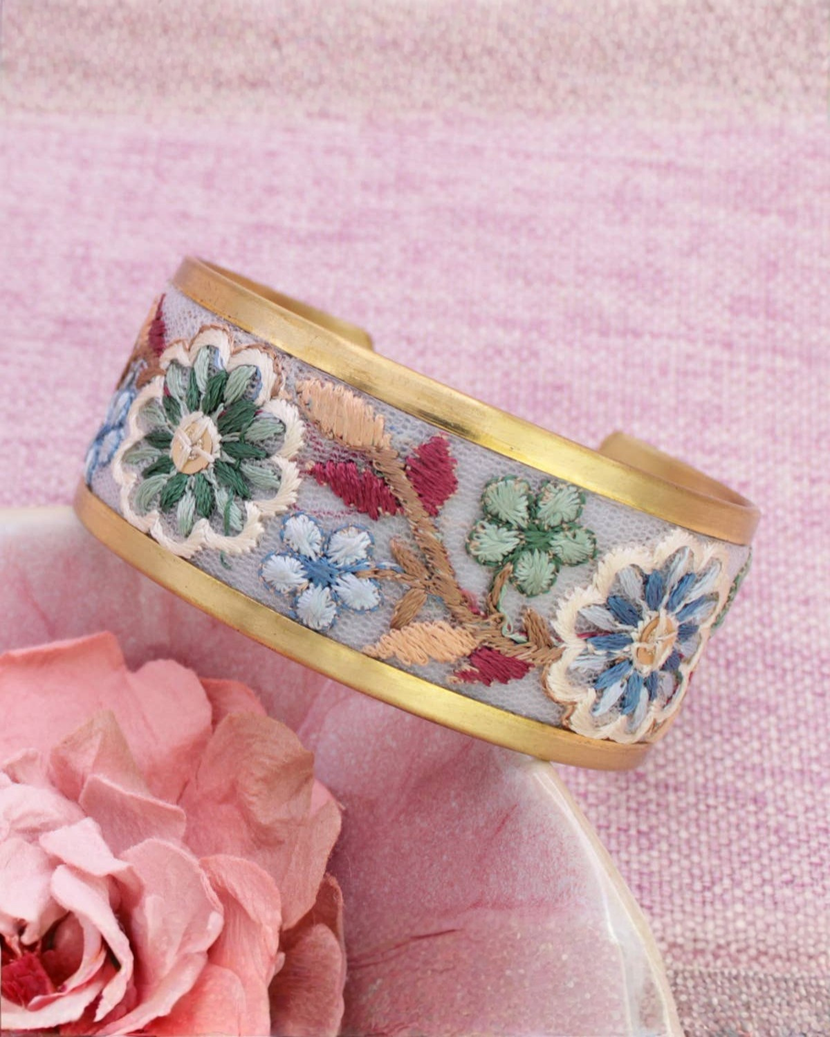 Fresh and softly romantic, this pastel floral embroidered cuff bracelet brings a touch of vintage spring to your everyday style. Delicate blue, green, pink, and peach floral embroidery is stitched into soft fabric and framed by a gleaming gold cuff, creating a piece that feels both lighthearted and refined. It’s an easy way to add cottage charm and gentle color to any outfit.