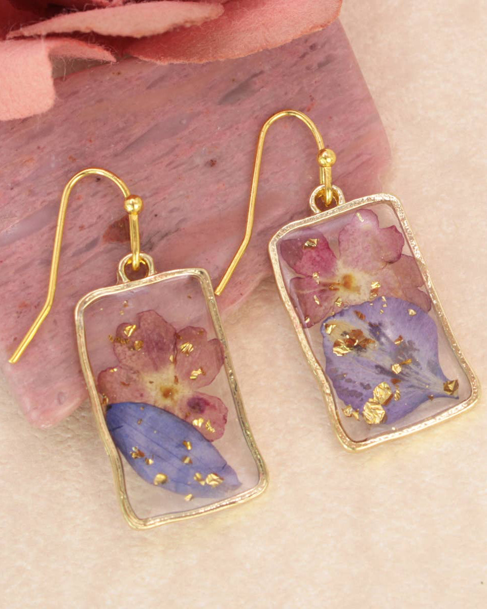 Sweet and softly nostalgic, these rectangular dried flower earrings showcase genuine pressed florals preserved in clear resin. Pink and purple flowers are framed by a gold border, creating a clean, vintage-inspired silhouette that feels light, natural, and effortlessly pretty.