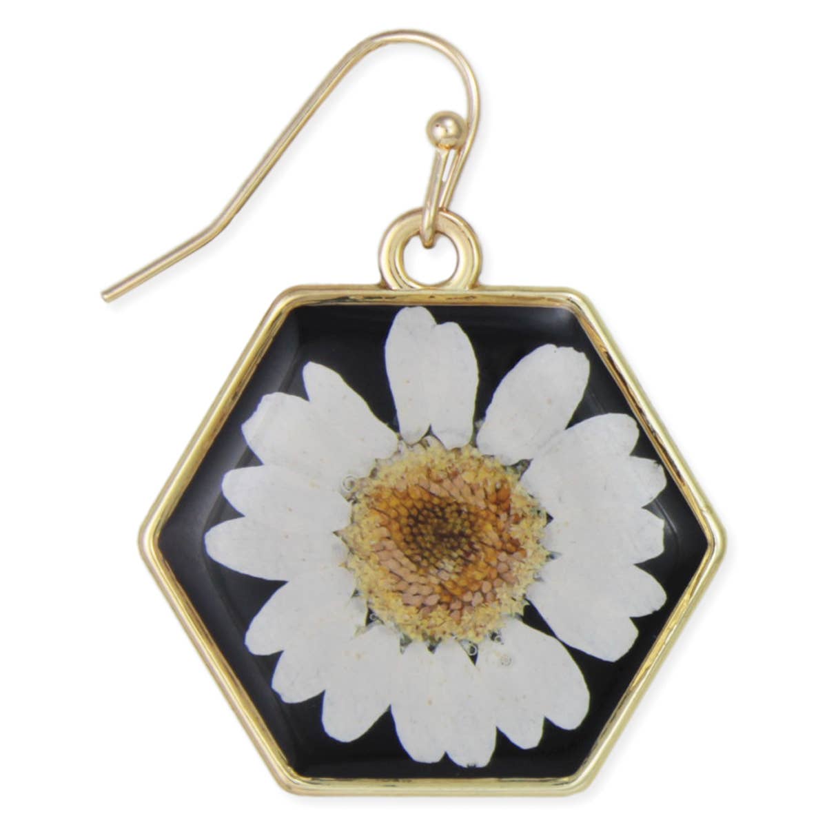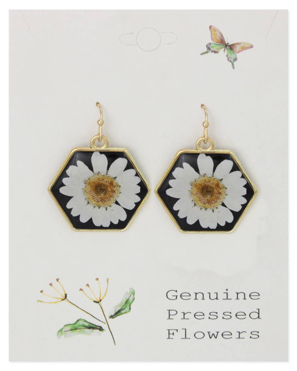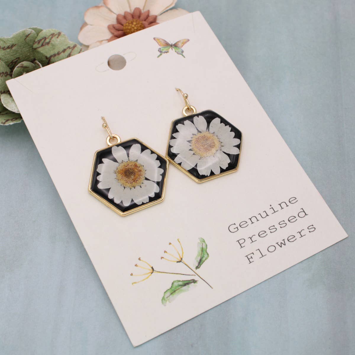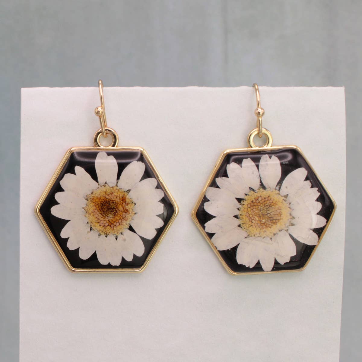 Bold and botanical, these black geometric earrings create striking contrast with genuine white dried flowers set inside sleek acrylic shapes. The modern silhouette paired with natural floral elements makes this pair a standout statement for anyone who loves artful design with a touch of nature.