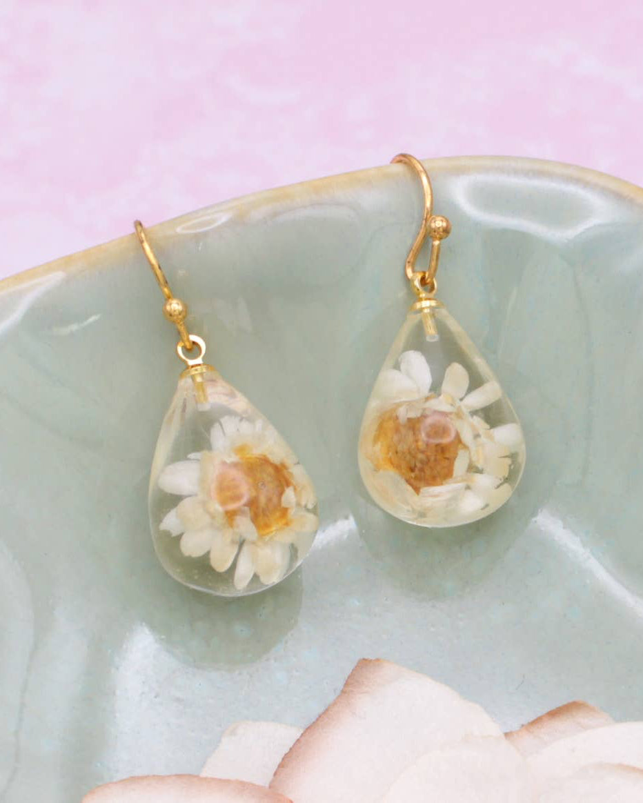 Light, airy, and beautifully understated, these clear teardrop earrings showcase genuine white dried flowers preserved in crystal-clear resin. Their soft, botanical design feels whimsical yet wearable, making them an easy choice for everyday outfits or special occasions.