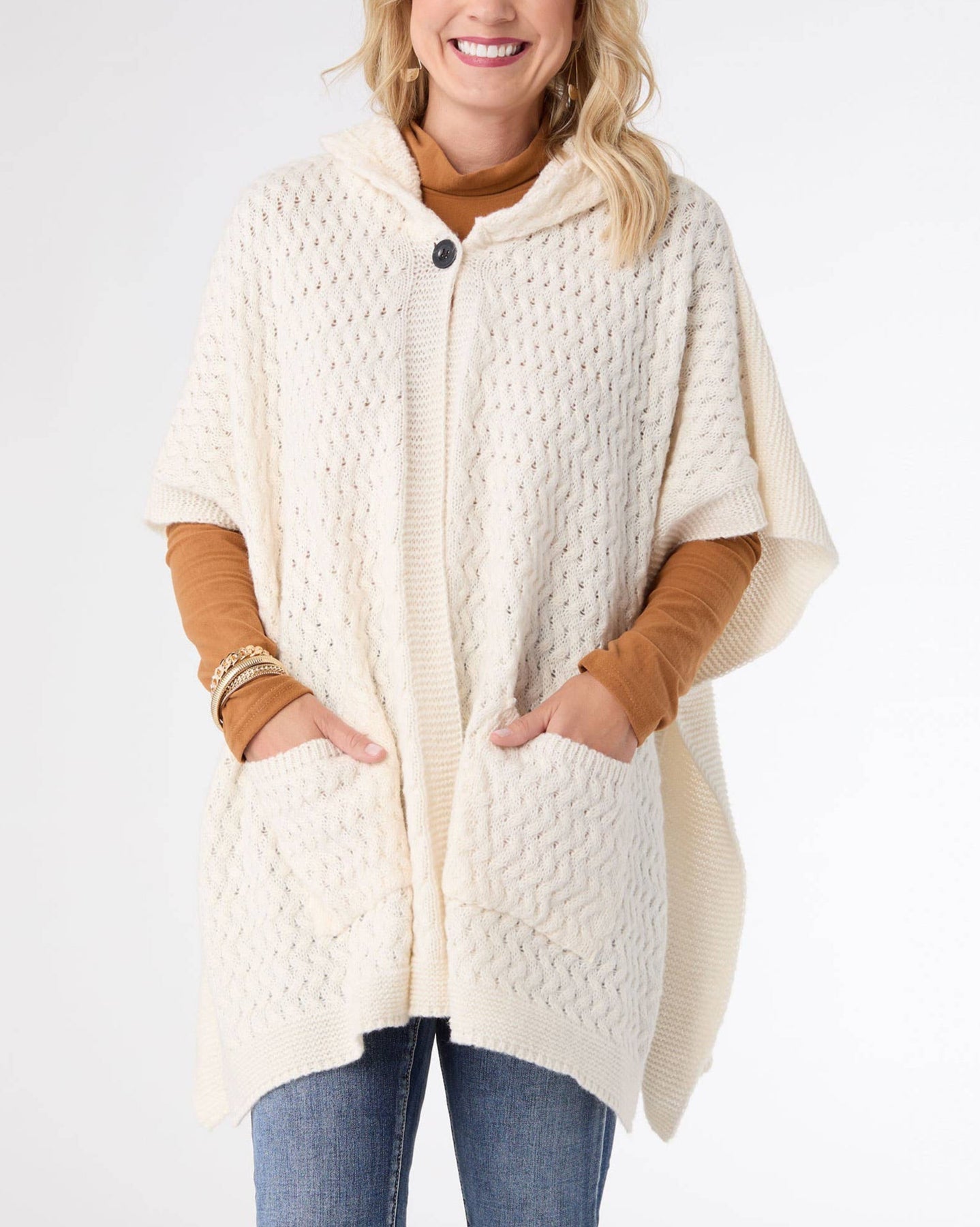Soft, neutral, and endlessly versatile—the Whitley Hooded Poncho in Off White is a cold-weather staple you’ll reach for again and again. With cozy front pockets and a built-in hood, it’s the perfect topper for chilly mornings, school pickups, or lounging in style.