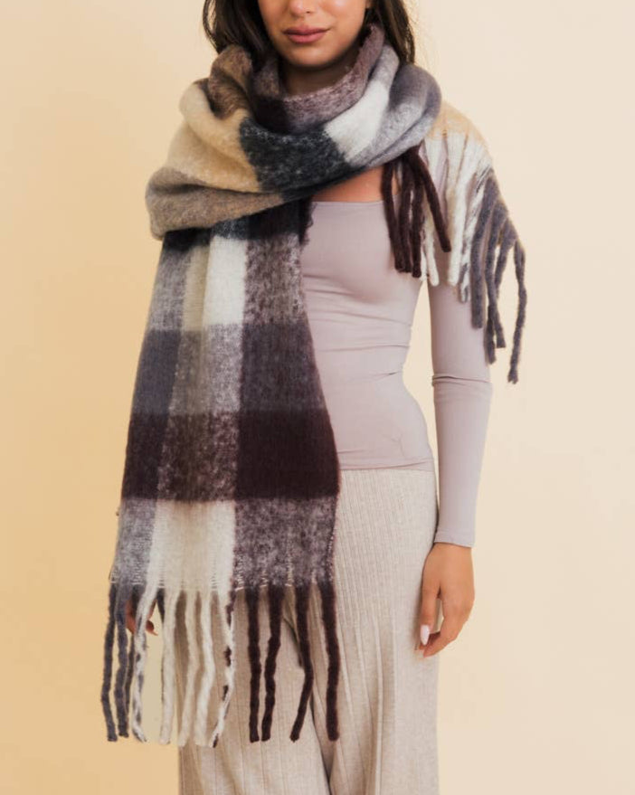 Wrap yourself in the season’s coziest accessory. This oversized fringe scarf blends warmth with effortless style, thanks to its soft plaid pattern and dramatic length. Toss it over your shoulders like a shawl or bundle it up for extra chill-fighting power—it’s as versatile as it is snuggly.