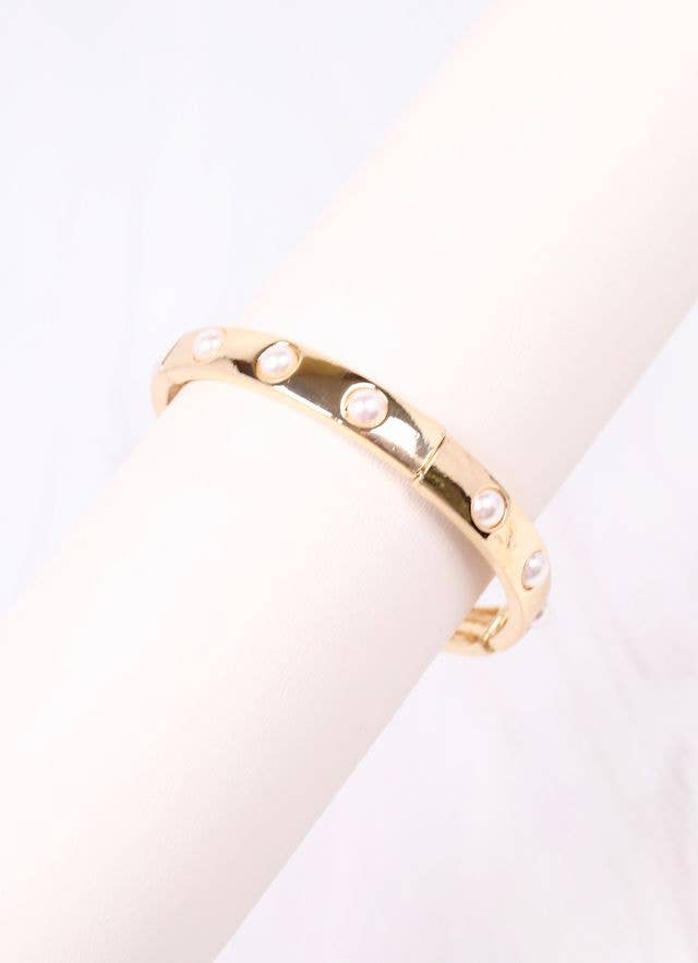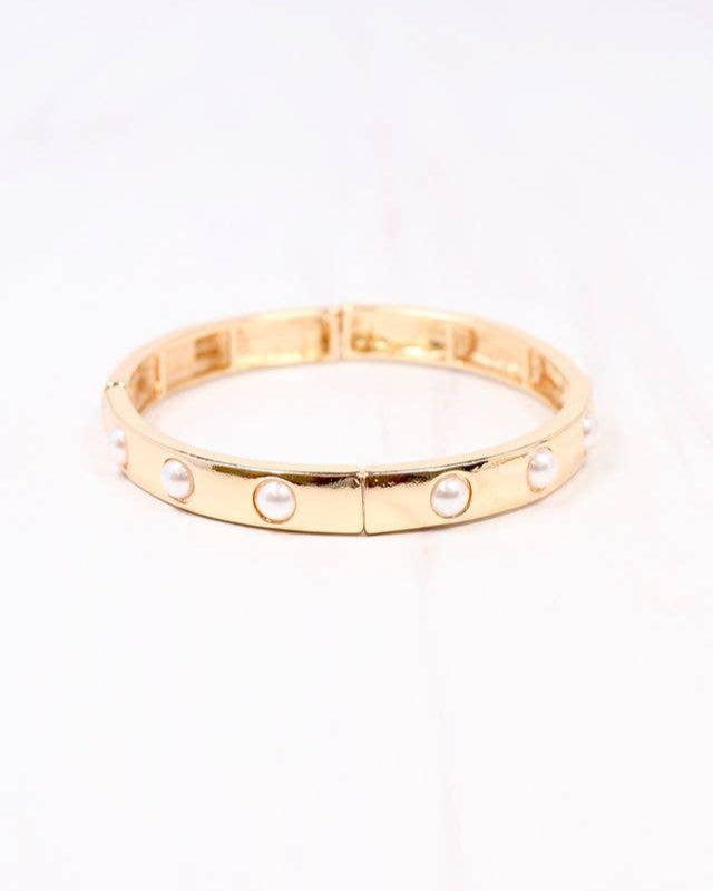 This shiny metal bracelet is accented with pearls for a classic style look. It wear like a bangle but stretches to fit most wrists. Style it by itself or in a stack with other bracelets for a fuller look.