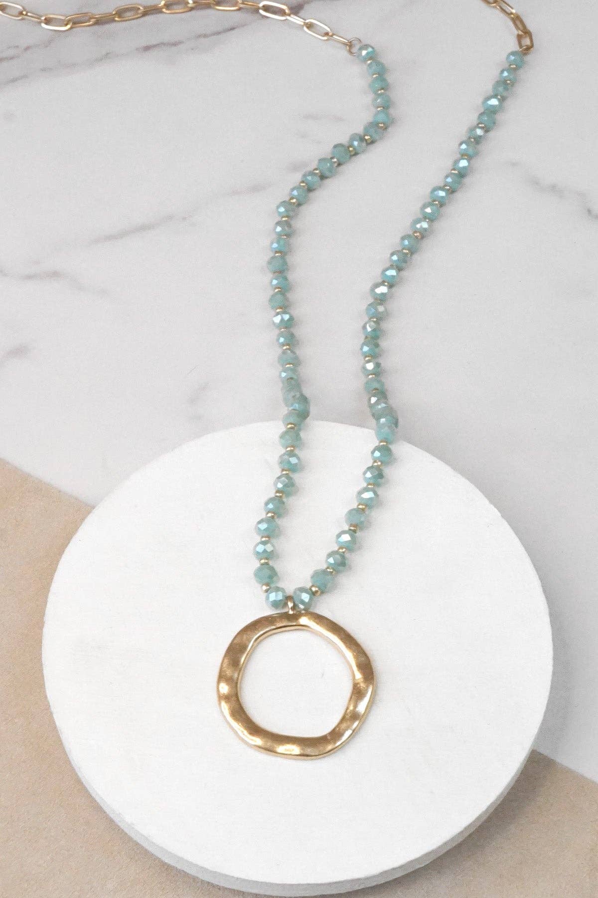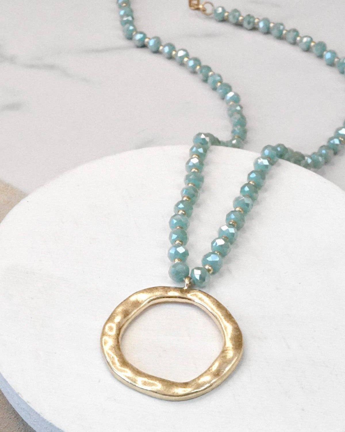 Add a splash of color to your look with this refreshing aqua beaded necklace. The faceted glass catches the light beautifully, complemented by a worn gold circle pendant for just the right touch of shine.