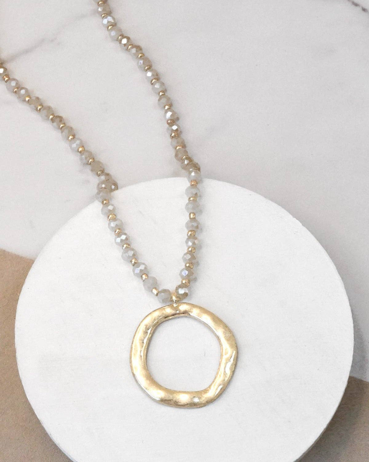 A classic silhouette with subtle sparkle, this neutral-toned necklace brings warmth and texture to any outfit. The combination of faceted beige glass beads and a worn gold-tone circle pendant creates a relaxed yet refined look that's easy to dress up or down.