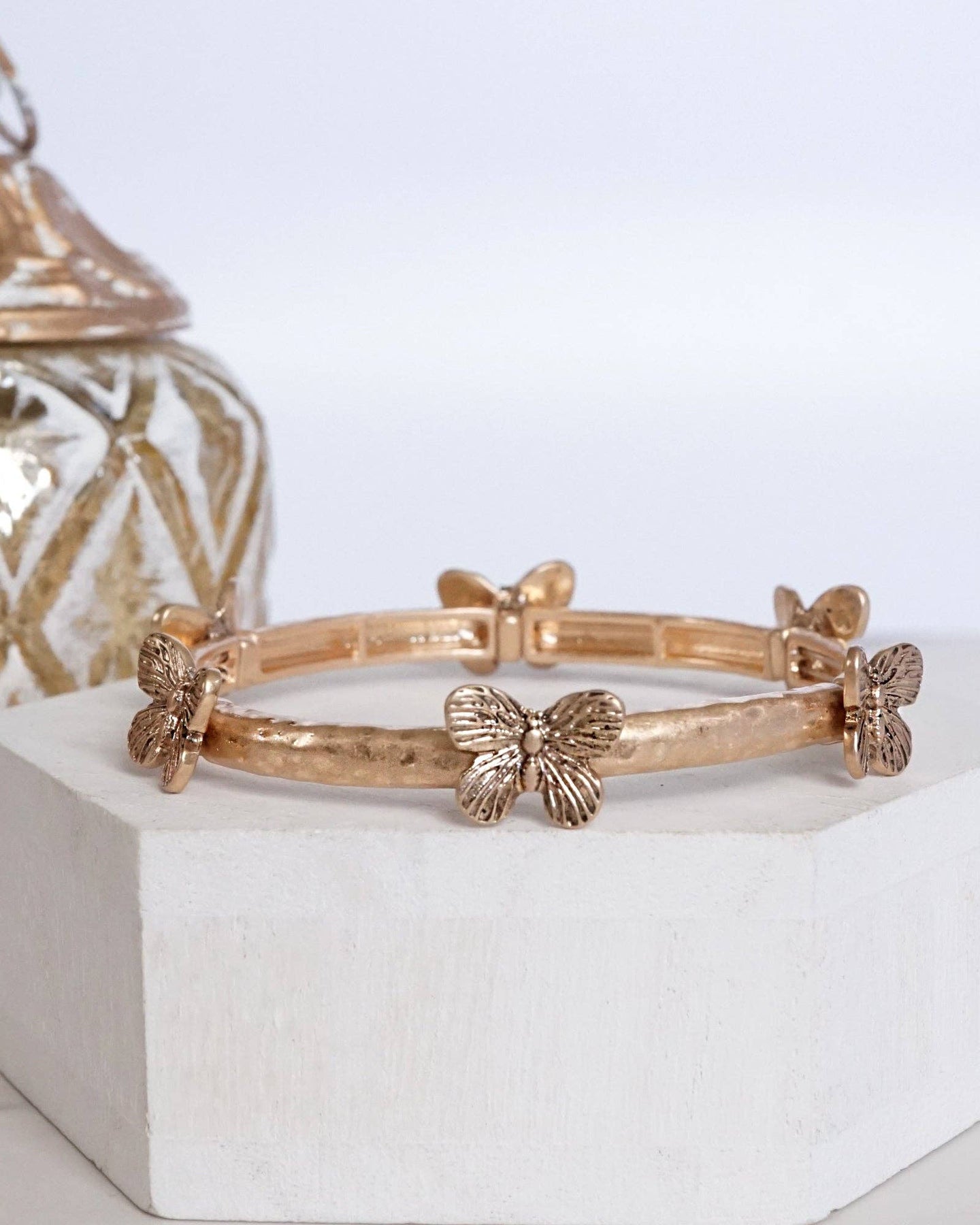 Bring a little whimsy to your wrist with this charming boho-style bangle. Featuring textured butterfly stations and a hammered worn gold finish, it’s a beautiful blend of rustic elegance and everyday ease.