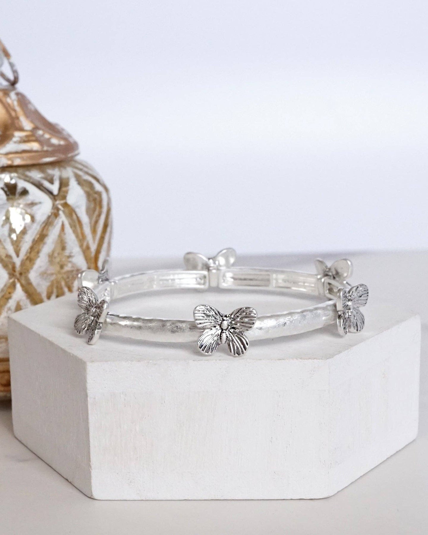 This enchanting silver-tone bangle blends organic charm with vintage texture. Its sweet butterfly stations rest on a hammered surface, offering just the right amount of shine with a relaxed, boho vibe.