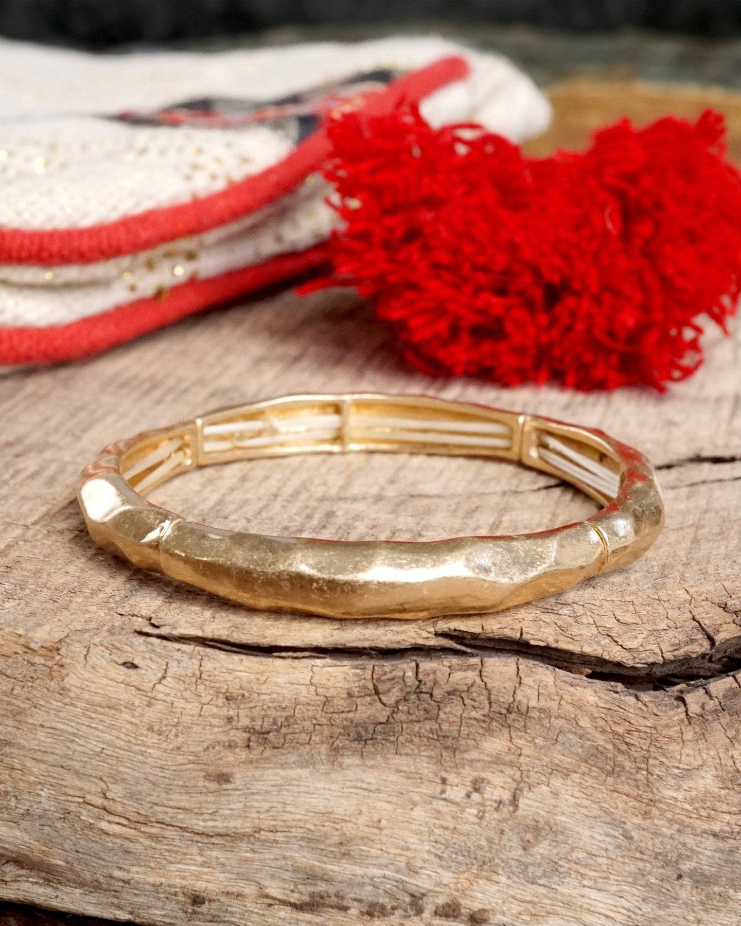 Understated yet full of texture, this worn gold bangle adds a subtle boho touch to your stack. Its raw hammered finish makes it feel organic and lived-in, while the stretchy fit keeps things effortless.