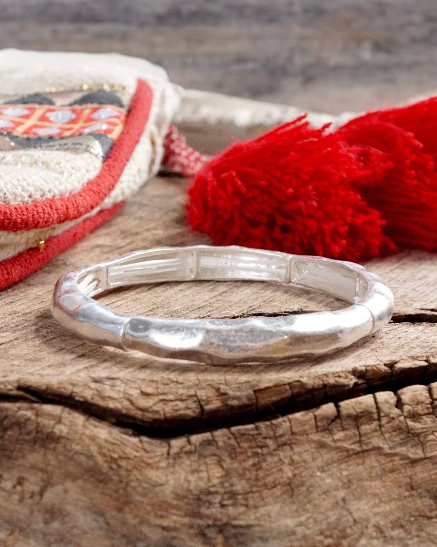 Designed with a hammered raw finish, this worn silver bangle brings an earthy, effortless vibe to your wrist stack. The lightweight, stretchy style makes it ideal for daily wear.