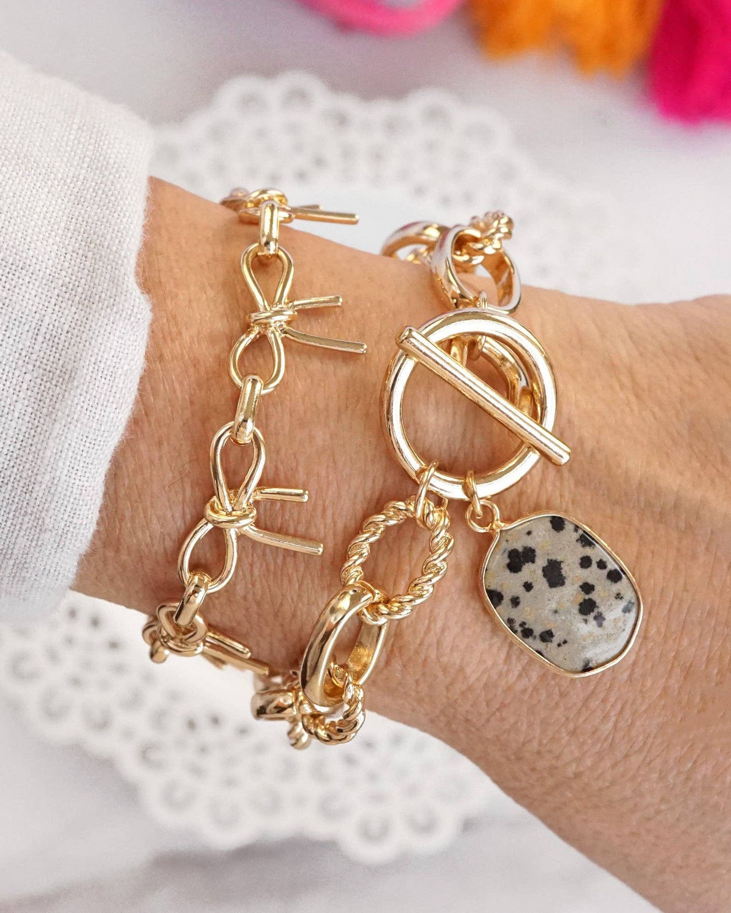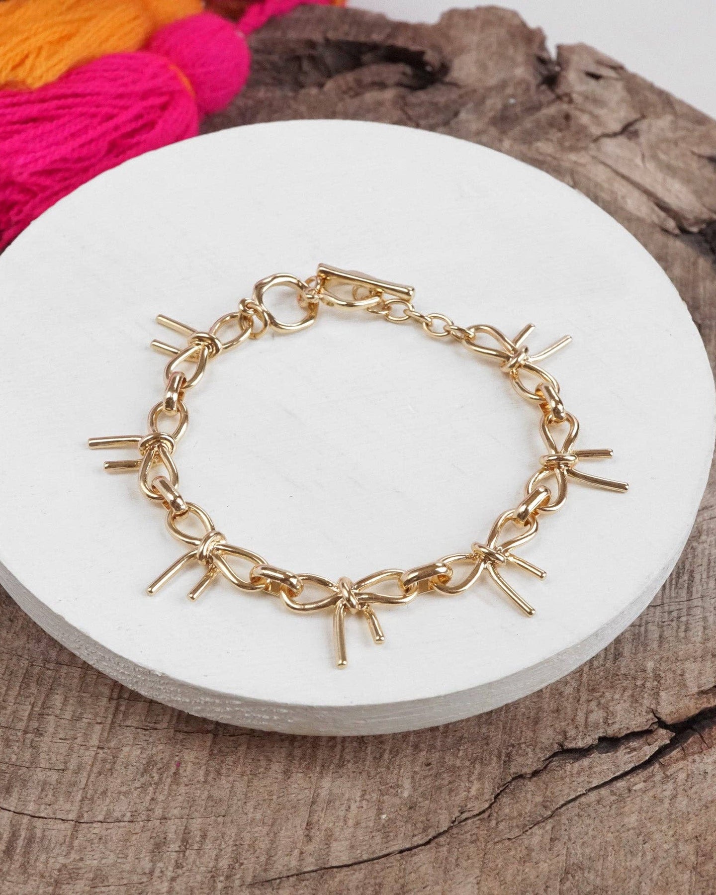 Chic and feminine, this gold-tone bracelet features a linked bow design that’s equal parts playful and polished. Its toggle clasp adds charm and ensures a secure fit, making it perfect for both casual and dressy days.