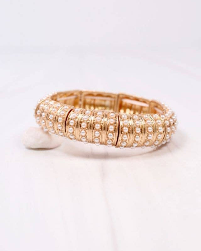 This elegant gold bracelet is adorned with accent pearls for an elegant look. It wears like a bangle and stretches to fit most wrists.