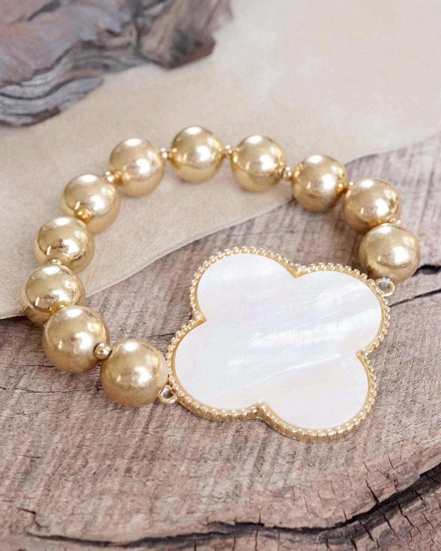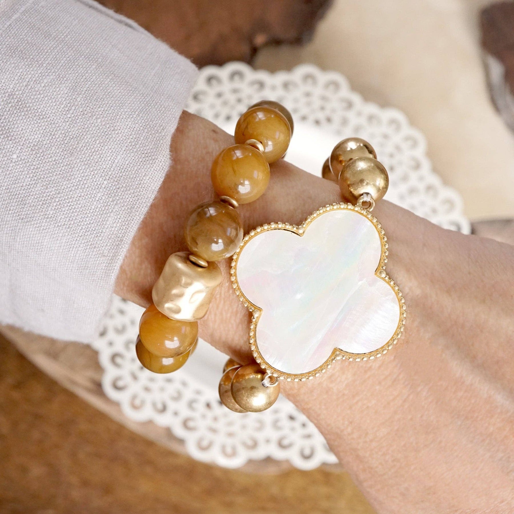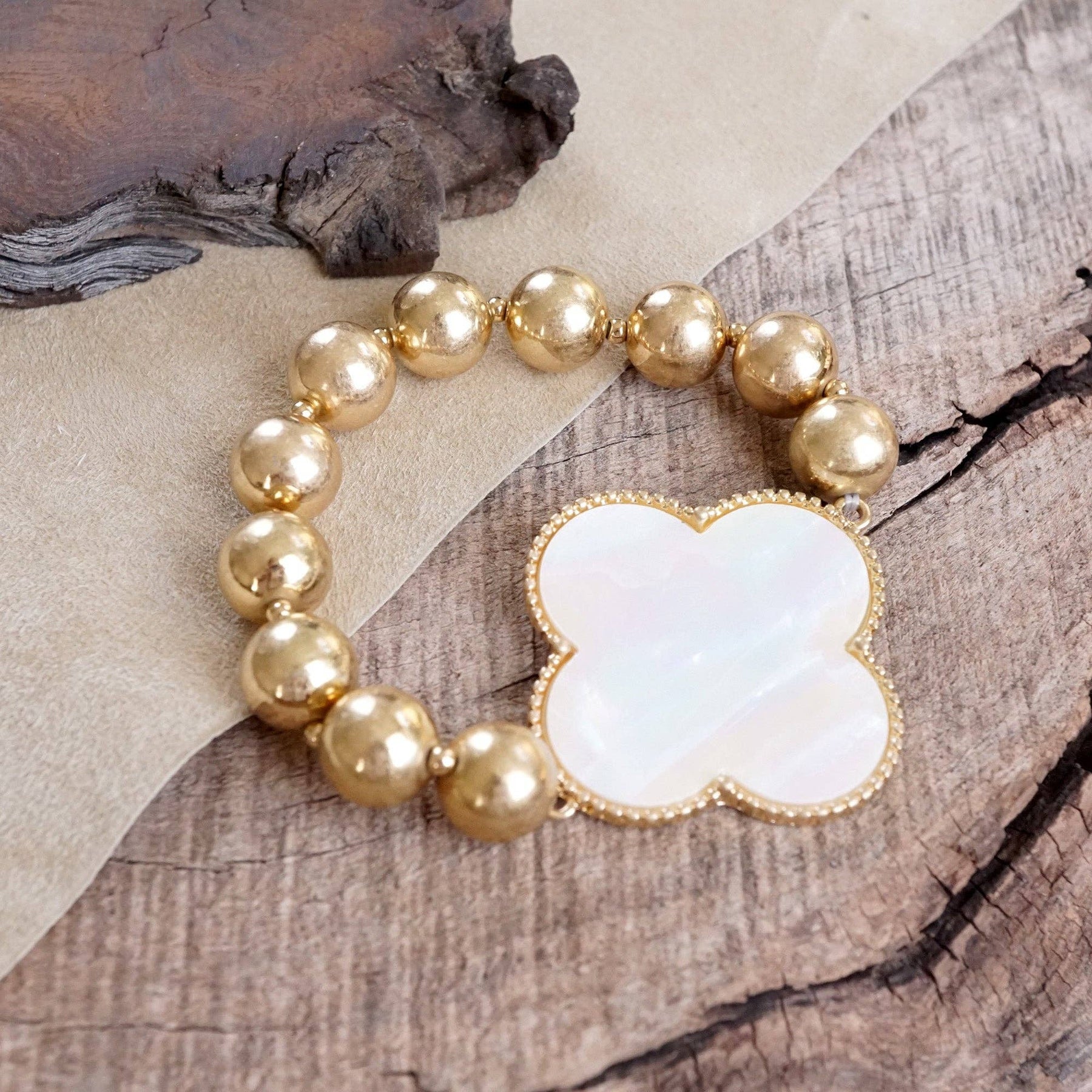 Fresh and timeless, this bracelet combines gleaming worn gold beads with a luminous white mother-of-pearl clover charm. It’s a versatile piece that complements both cool and warm tones, making it a favorite for every season.