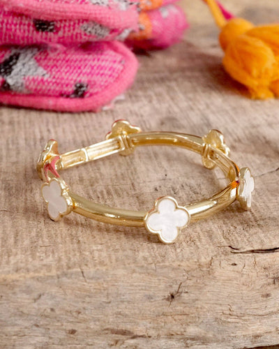 A beautiful blend of shimmer and structure, this gold-tone bangle features glowing mother-of-pearl clover stations that add a sophisticated pop. The hammered texture brings in a touch of rustic charm, while the stretch fit makes it easy to wear from day to night.