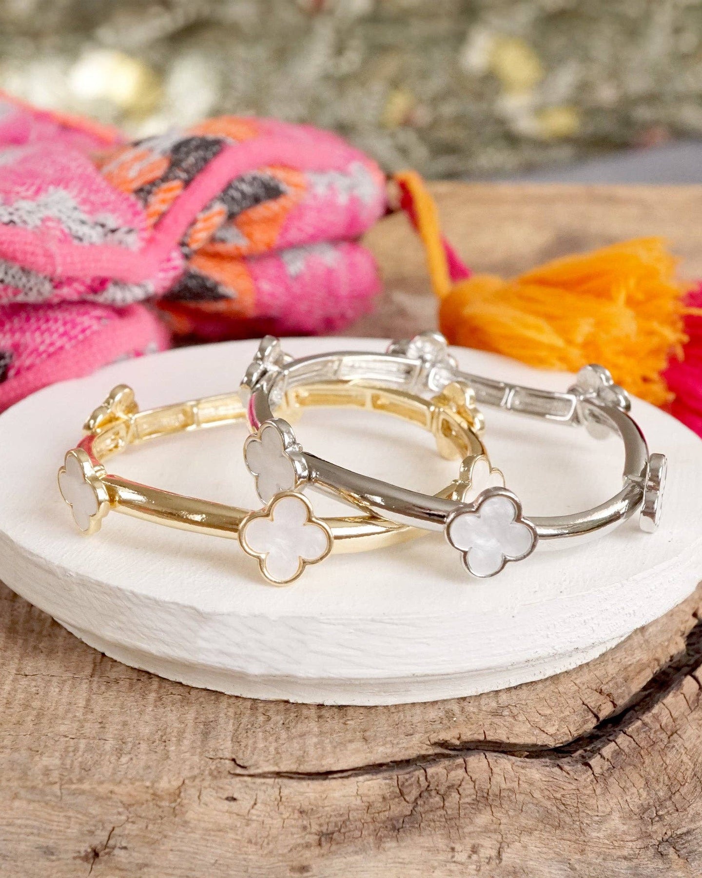 Elegant yet effortless, this silver-tone stretch bangle is dotted with mother-of-pearl clovers that shimmer with natural beauty. The hammered metal finish adds depth and texture to this timeless piece.