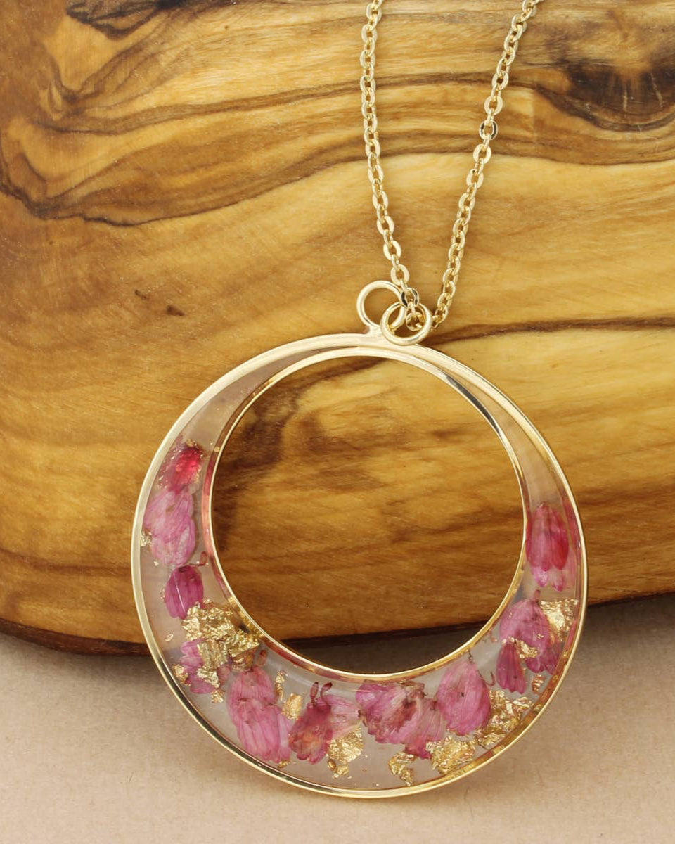 This botanical-inspired necklace features forget-me-not blooms and delicate grain accents set in clear resin and bordered with gold. The round pendant hangs from an adjustable gold chain for a sweetly nostalgic finish.