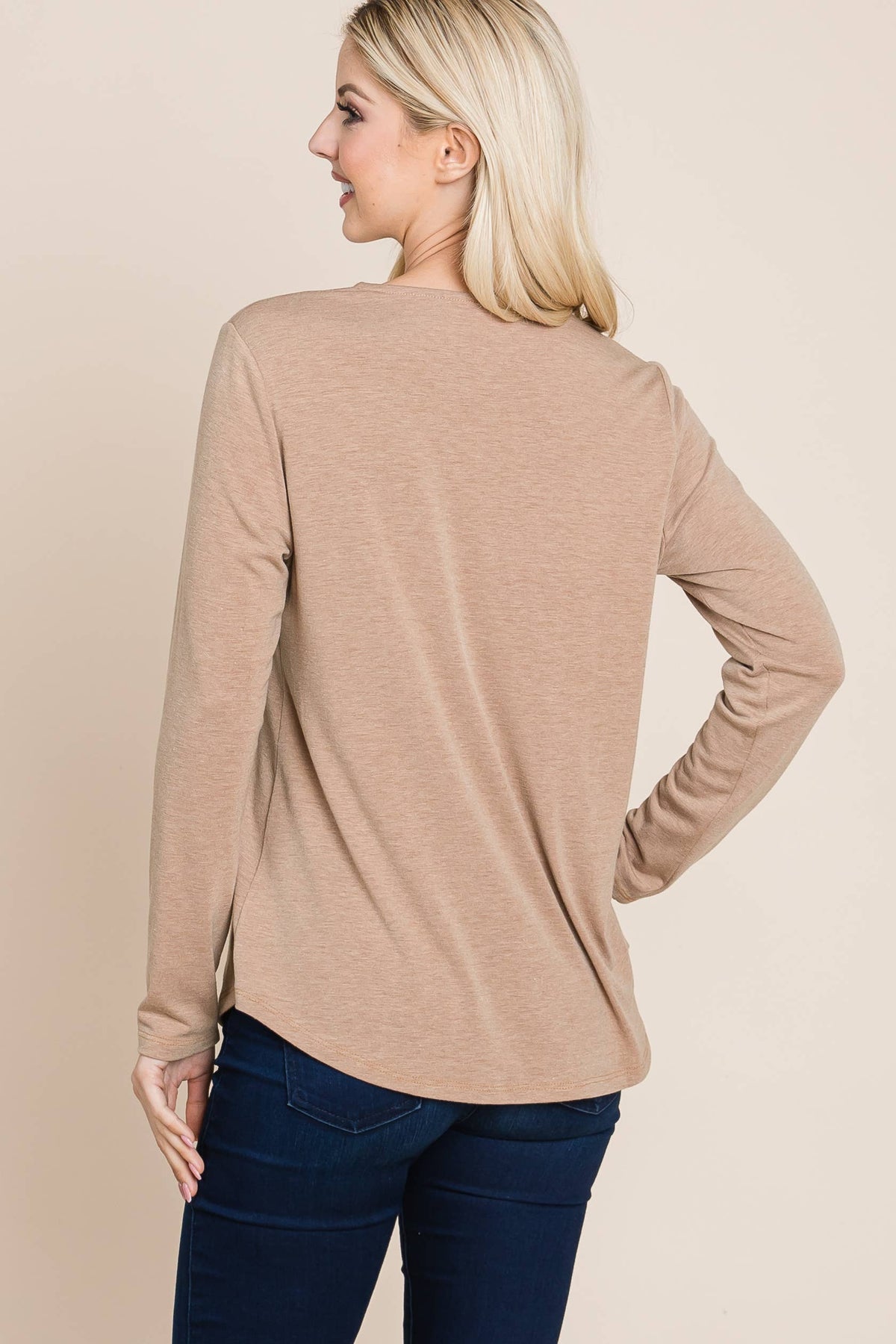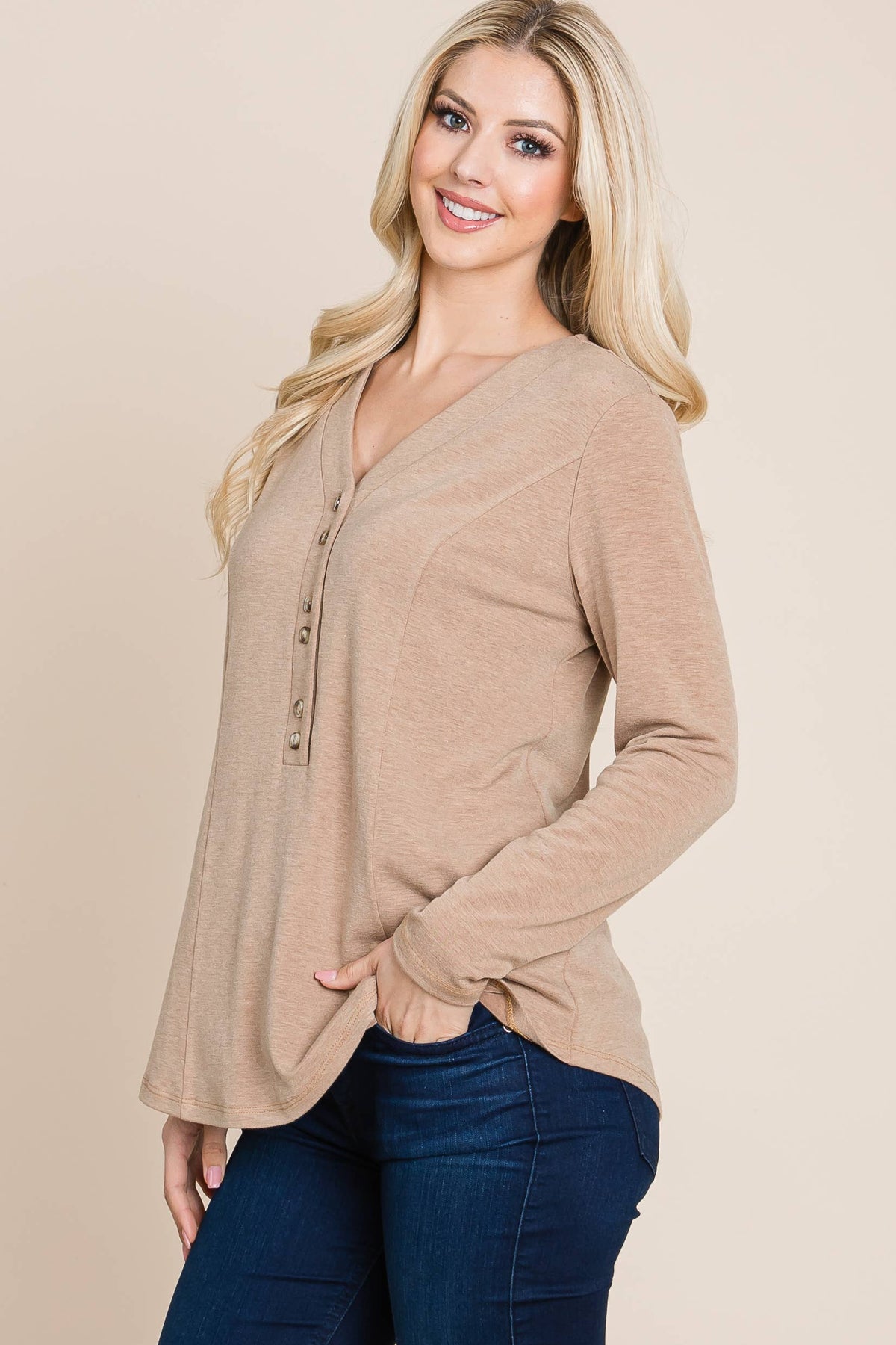 Embrace effortless style with this thoughtfully designed two-tone long sleeve top. Crafted from soft, luxurious fabric, it drapes beautifully while keeping you comfortable throughout your day. The refined v-neck and decorative button details add sophistication without sacrificing ease. Whether you're building a capsule wardrobe or refreshing your everyday basics, the complementary tone combination pairs seamlessly with everything you own. This is the reliable piece you'll reach for again and again, knowing it supports your lifestyle and your style.