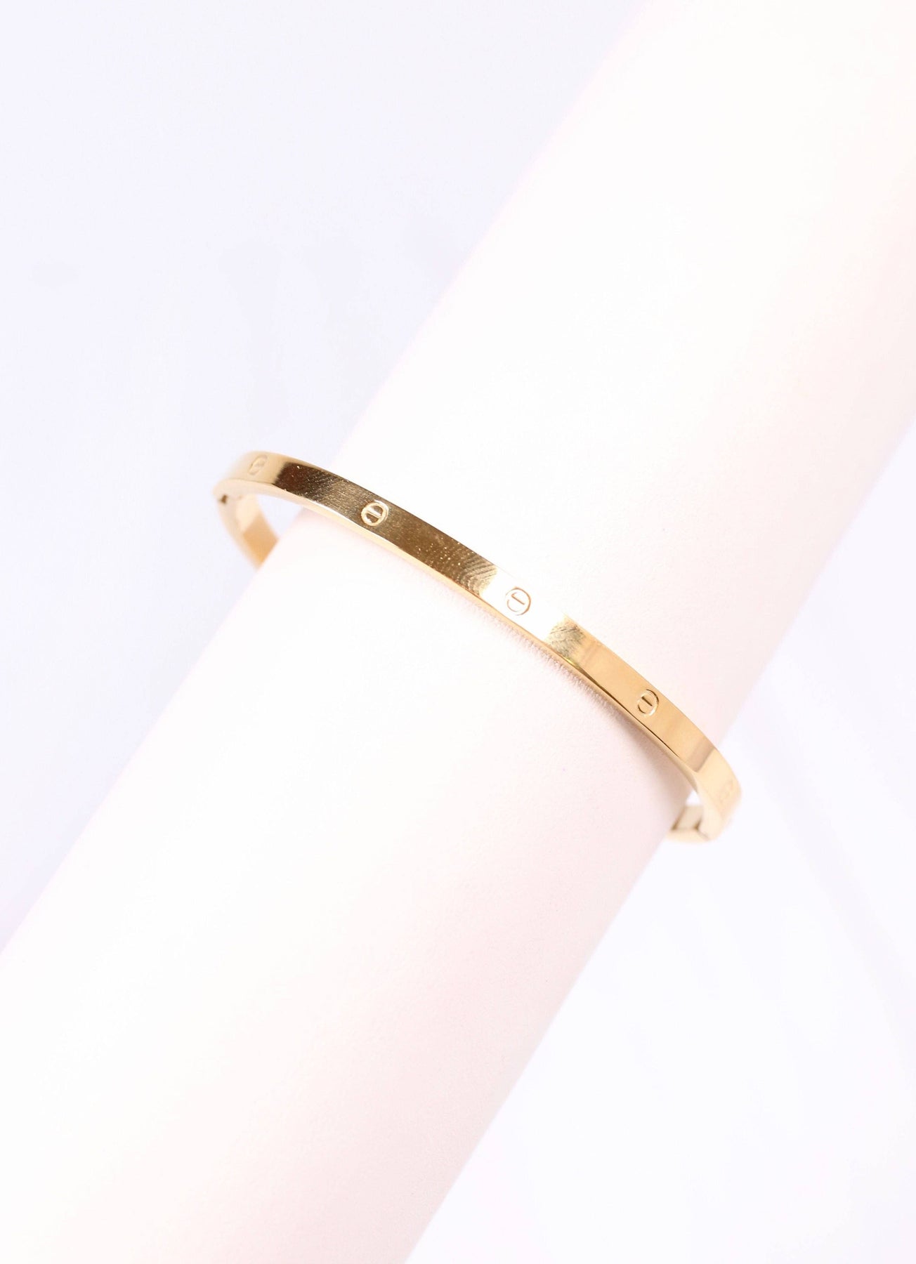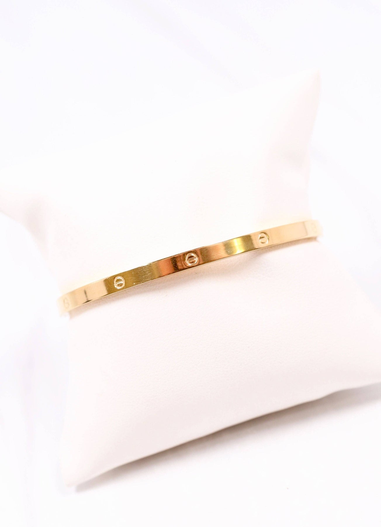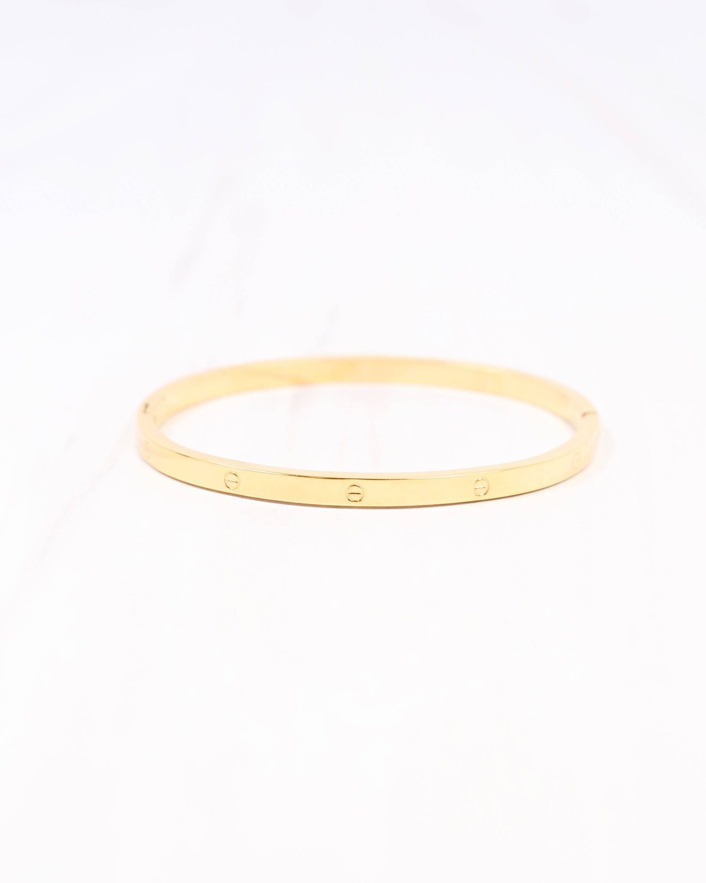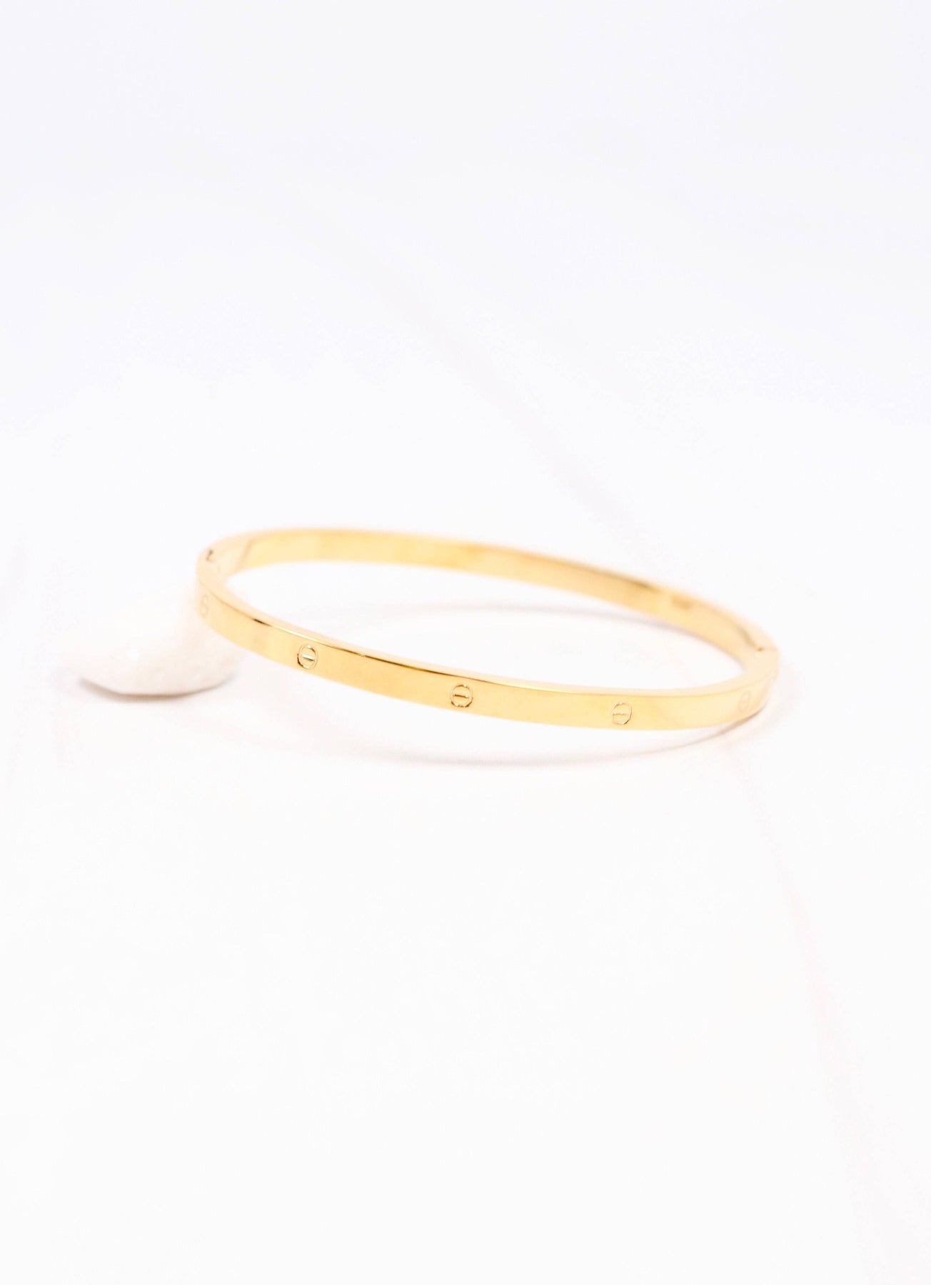 Minimal yet stylish, the Freeman Bracelet in gold brings understated elegance to your wrist. With fine etched details, a thin profile, and an easy hinge closure, this gold bracelet goes with everything from casual denim to dressier looks.