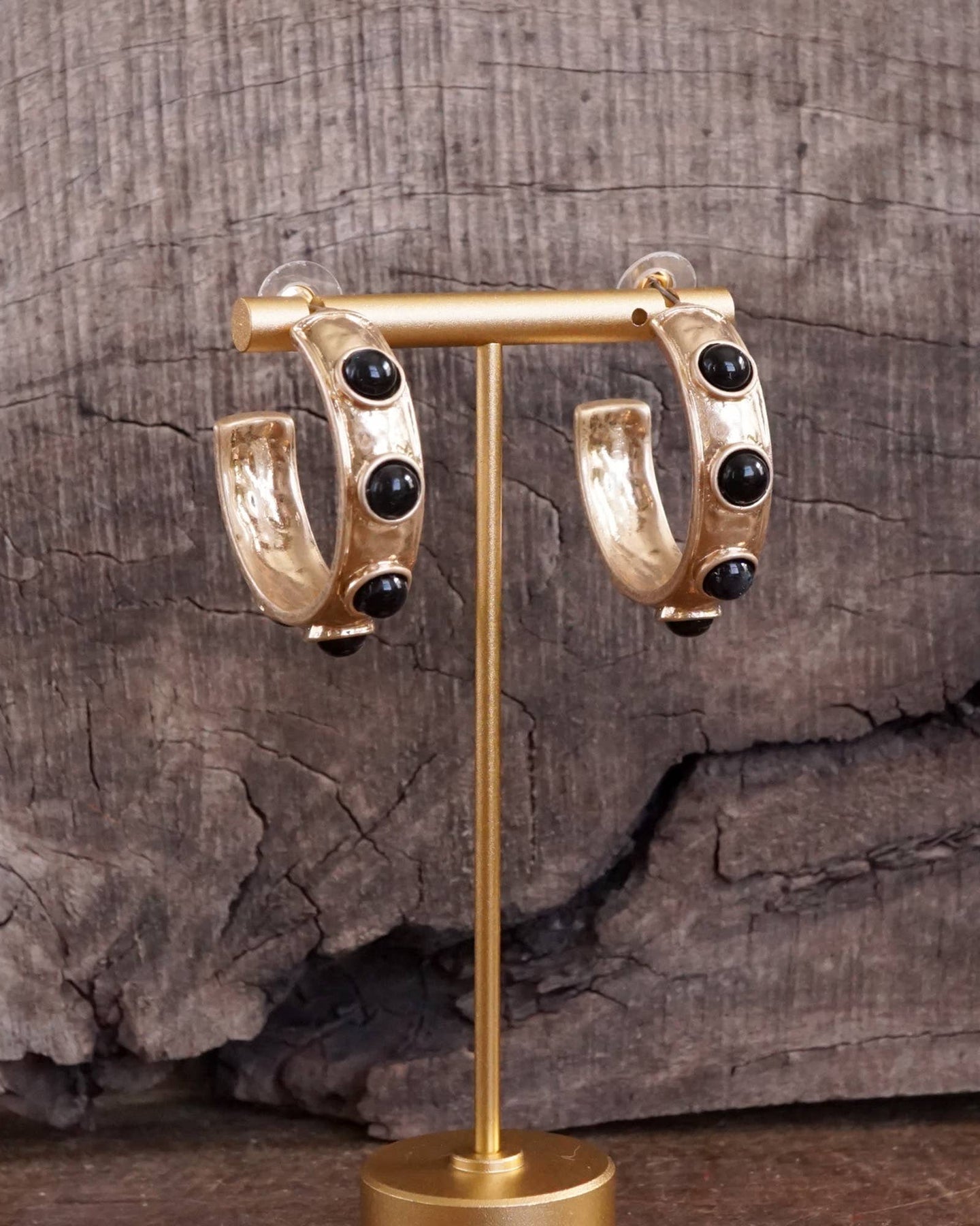 Sleek and striking, these textured gold-tone hoops feature deep black cabochons for a chic, modern edge. Whether you're dressing up denim or accessorizing eveningwear, this pair adds just the right amount of artistic flair.