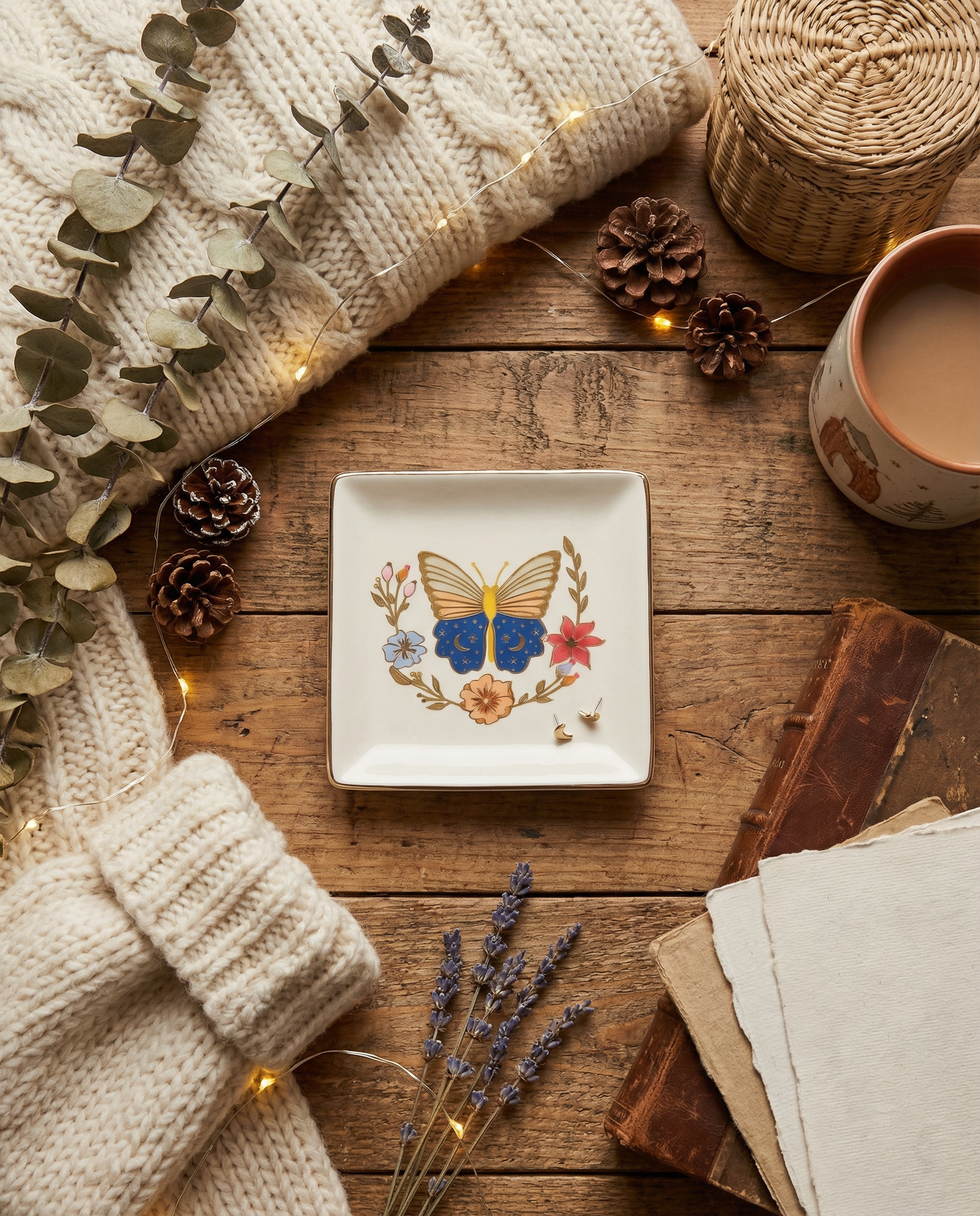 Delicate and dreamy, this butterfly-themed set adds a whimsical touch to your jewelry collection. The ceramic dish is a beautiful home for rings and trinkets, while the coordinating butterfly earrings add a flutter of charm to your everyday look.