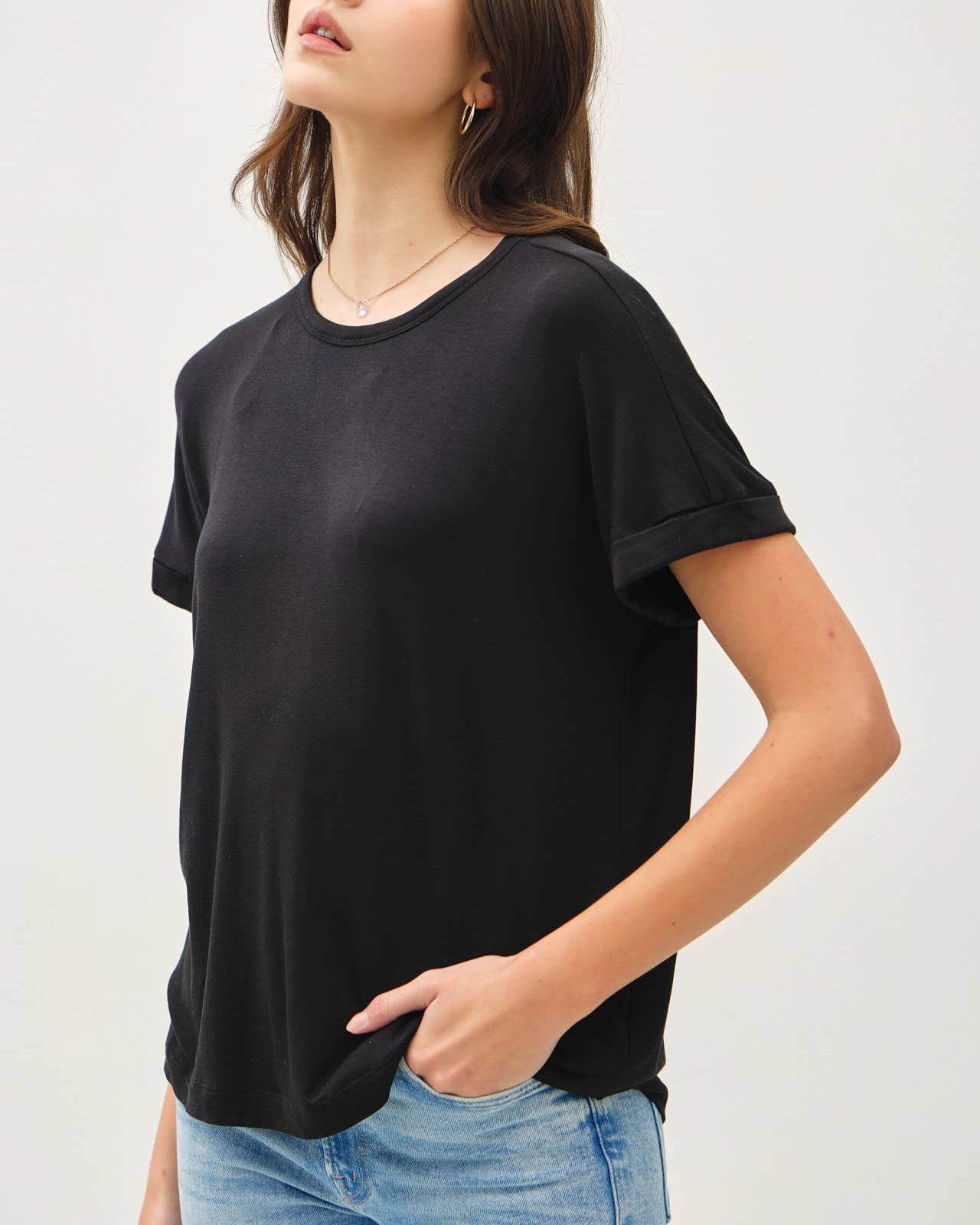 Elevate your basics with this ultra-soft black modal tee. Designed with a flowy fit and rolled sleeve detail, it’s an easy choice for both laid-back weekends and dressed-up layering. Its lightweight feel and clean finish make it a must-have for every capsule wardrobe.