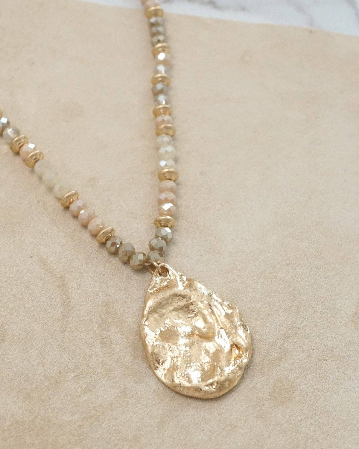 This timeless beaded necklace brings together neutral tones and a softly textured gold teardrop pendant for an effortlessly elegant finish. The mix of faceted glass and metal beads adds a hint of sparkle and earthy charm—perfect for layering or wearing solo.