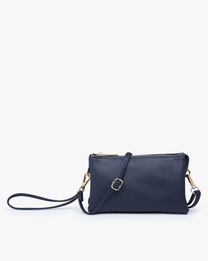 The Riley Monogrammable 3 Compartment Crossbody/Wristlet in Navy is a perfect blend of style and functionality. Crafted from premium vegan leather and finished with elegant gold hardware, this versatile accessory seamlessly transitions from day to night. With its top zipper closure and organized compartments, it offers ample storage while maintaining a sleek silhouette. Personalize it with a monogram to make it uniquely yours or gift it to someone special.