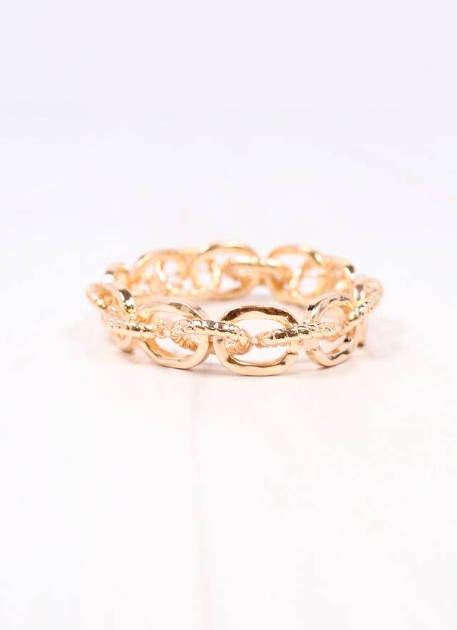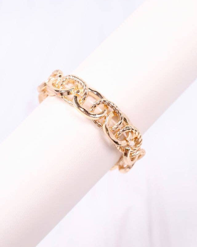 This link bracelet is a perfect stackable piece. It has smooth and textured links for a simple yet timeless look. Stretches to fit most wrists.