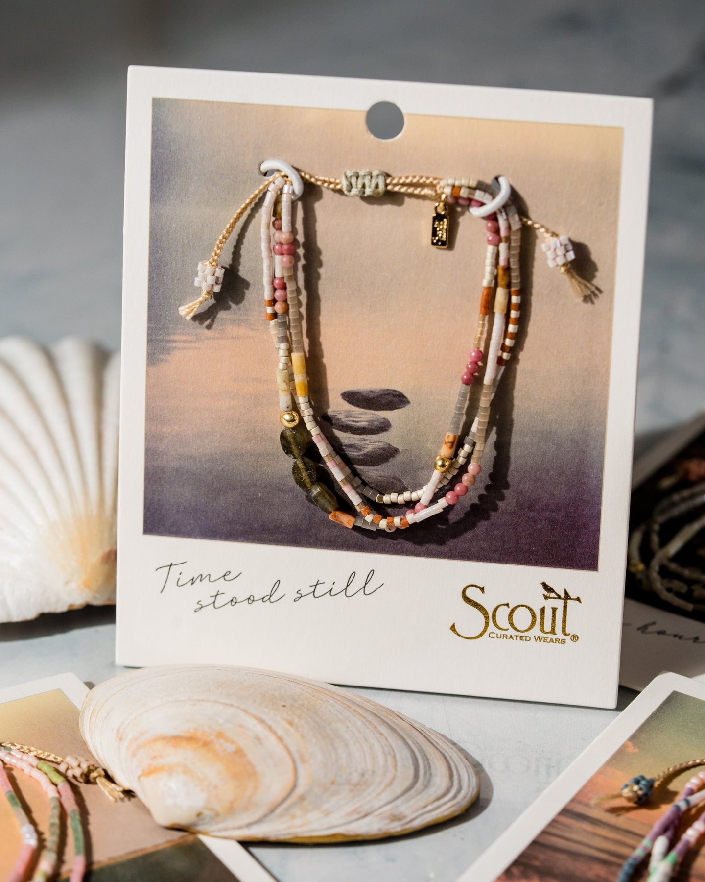 The semi-precious stone and its meaning are highlighted on the back of each card and connect to the photograph on the front of the card. Each playful stacking bracelet incorporates semi-precious stones along with Japanese glass Miyuki beads.