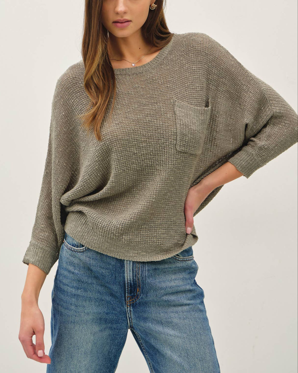 In an earthy light olive, this soft knit pullover is a go-with-everything favorite. The chest pocket and subtle texture give it just enough detail to keep things interesting.