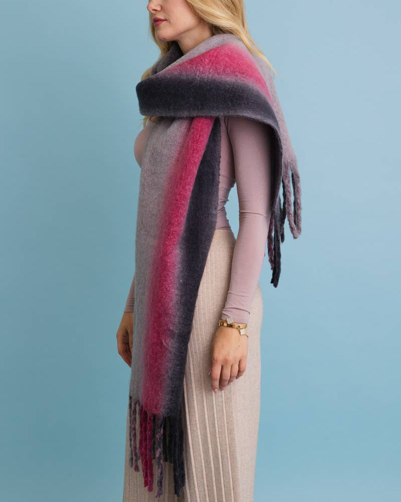 A beautifully soft two-tone scarf that adds instant sophistication to your winter wardrobe. This chic, oversized design drapes effortlessly, offering warmth without bulk and subtle style that pairs with everything from sleek coats to casual knits. Finished with long tassels for a classic, cozy touch.